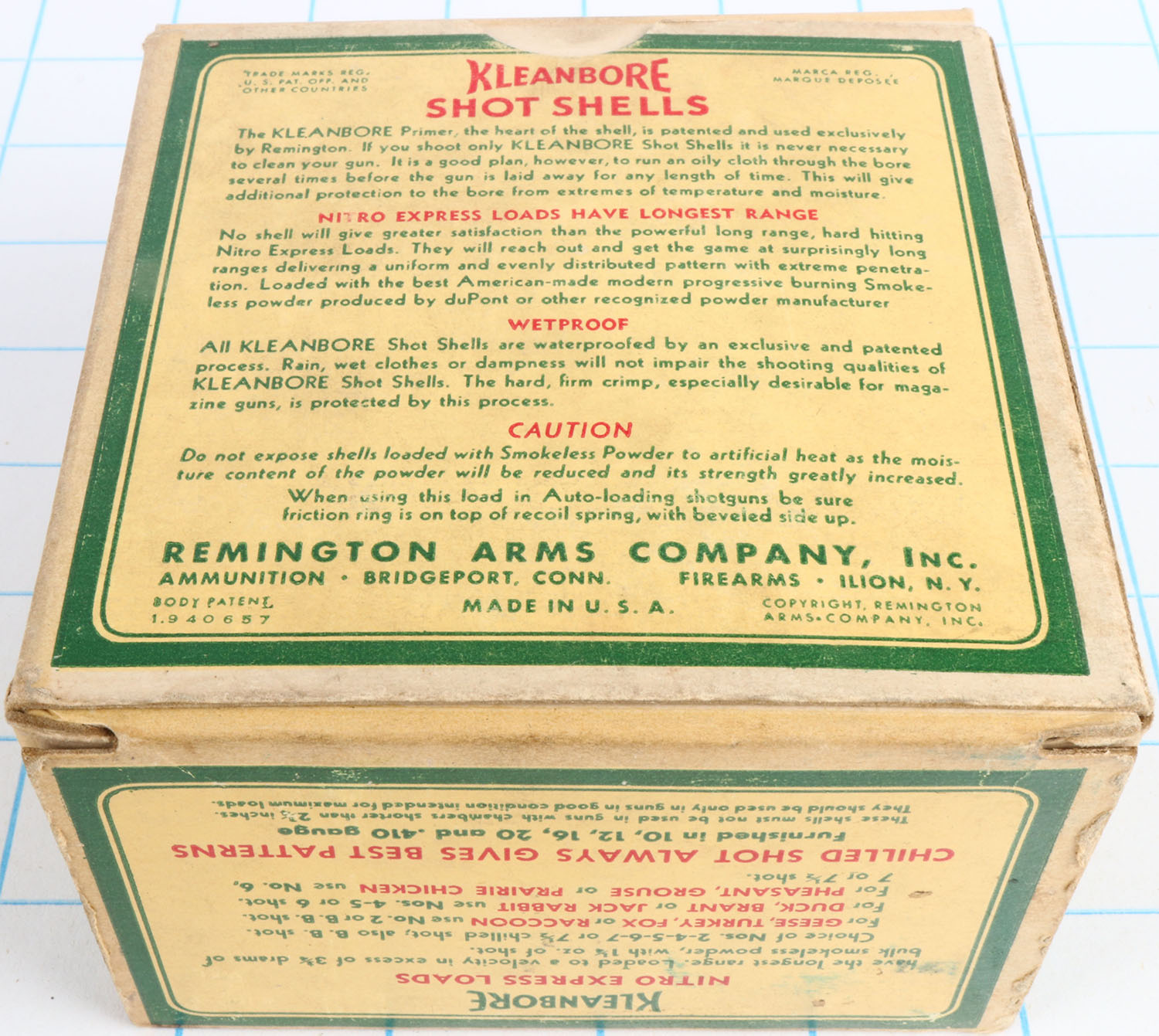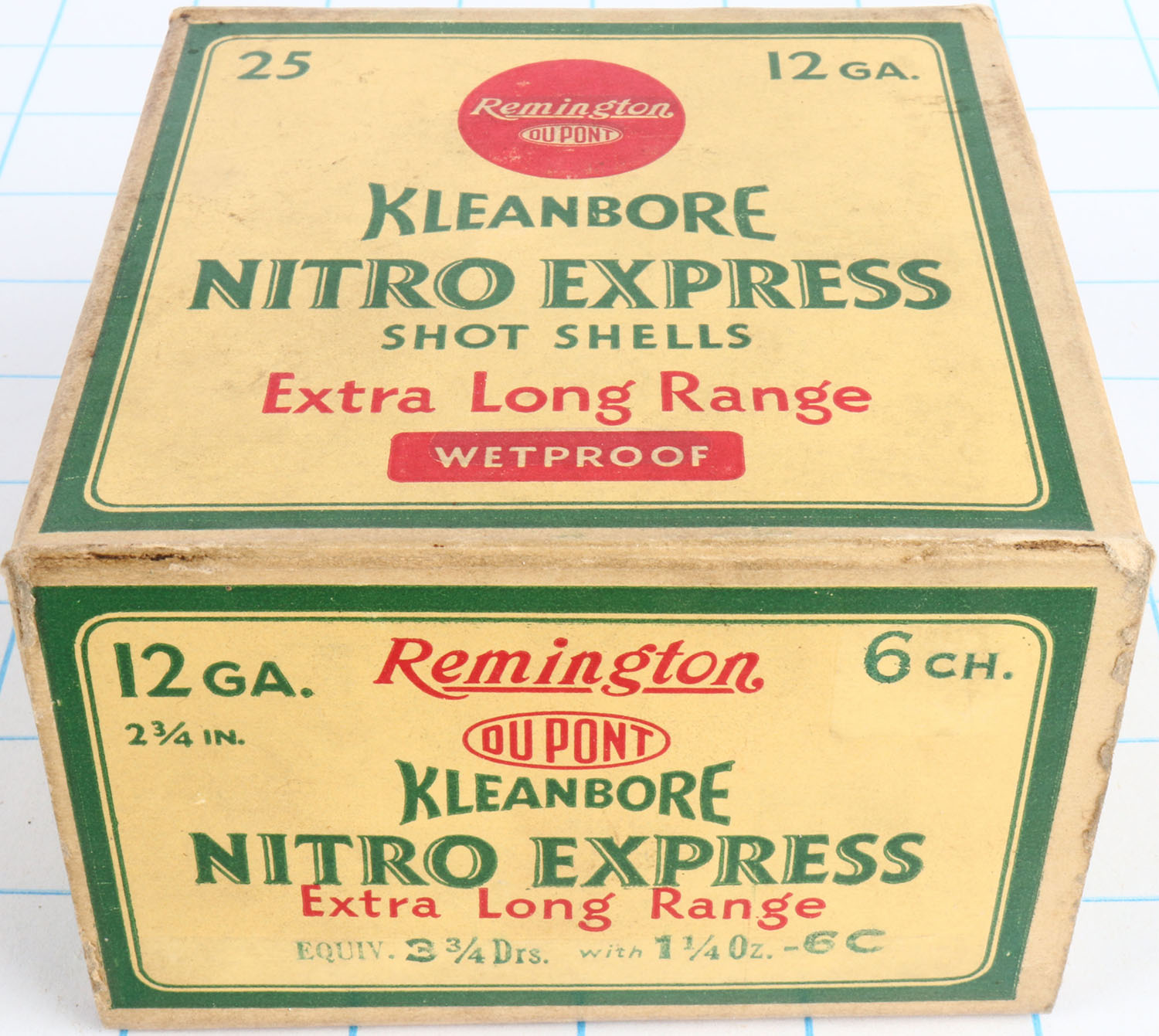 Remington Kleanbore, NITRO EXPRESS, 12ga., 1pc., Partial 20rds., shot size 6 CH, box is yellow, red and green, box is solid with light edge wear & great colors, shells are excellent. Grade: Excellent + - Value: 10 to 50