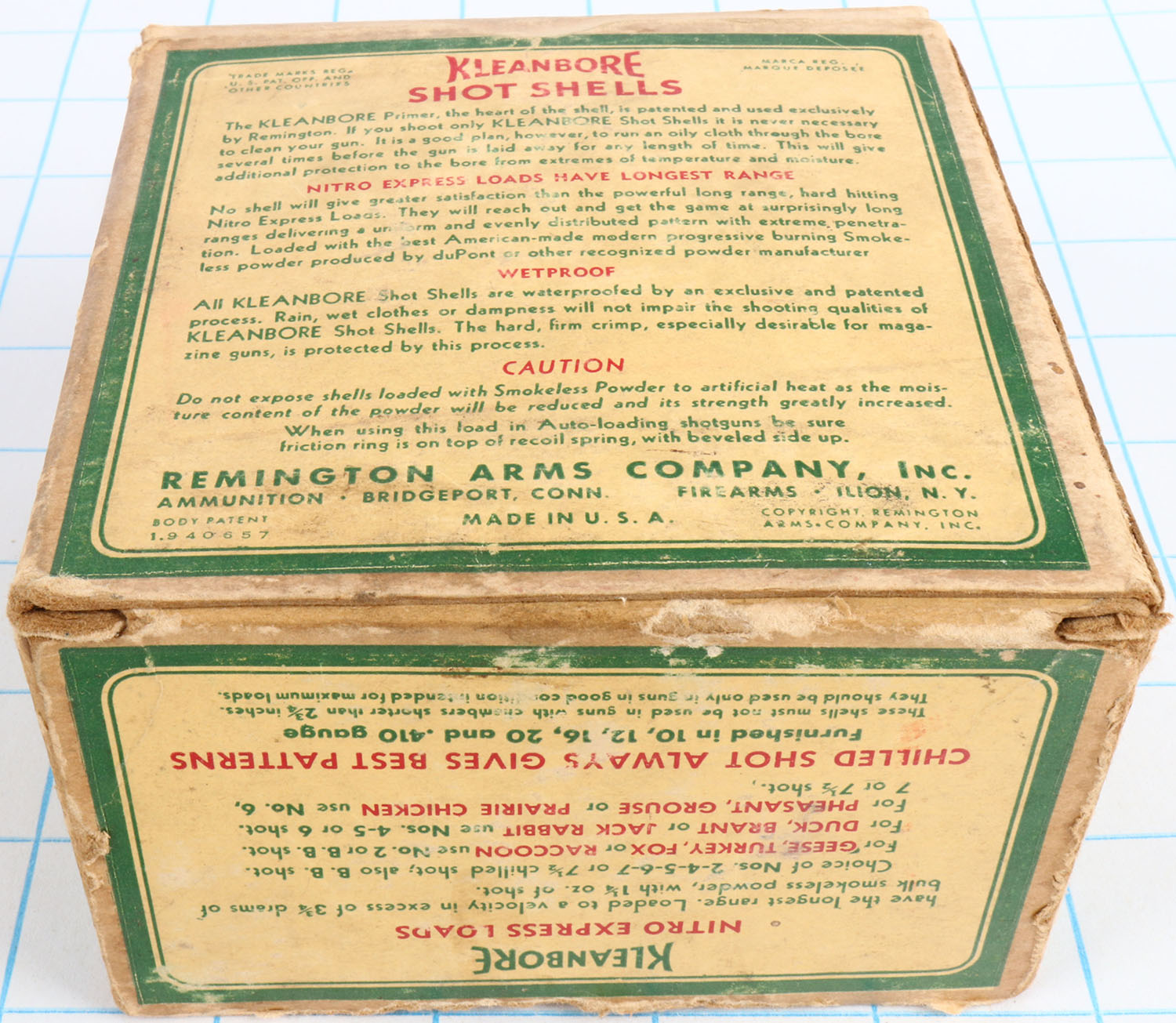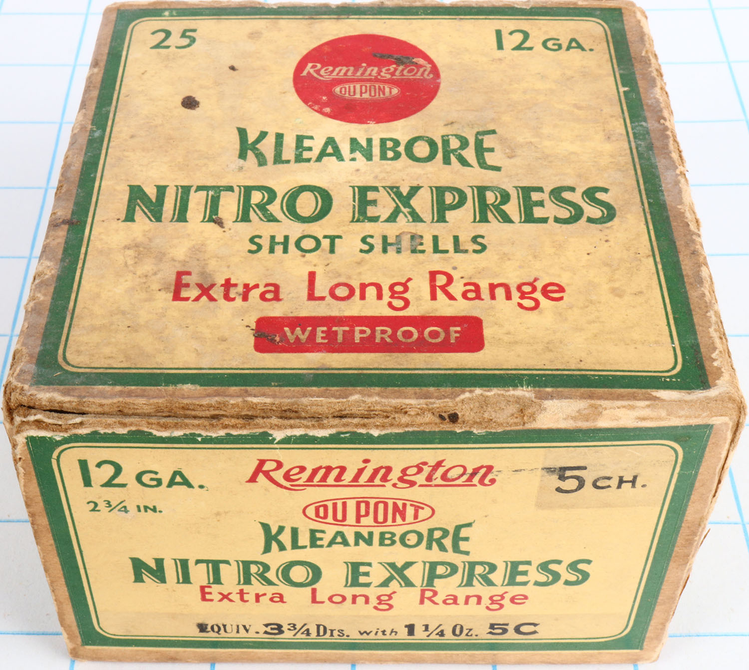 Remington Kleanbore, NITRO EXPRESS, 12ga., 1pc., Partial 21rds., shot size 5 CH, box is yellow, red and green, box is solid, has age soiling, edge wear & tear in top flap with very nice colors, shells are very good. Grade: Very Good ++ - Value: 10 to 50