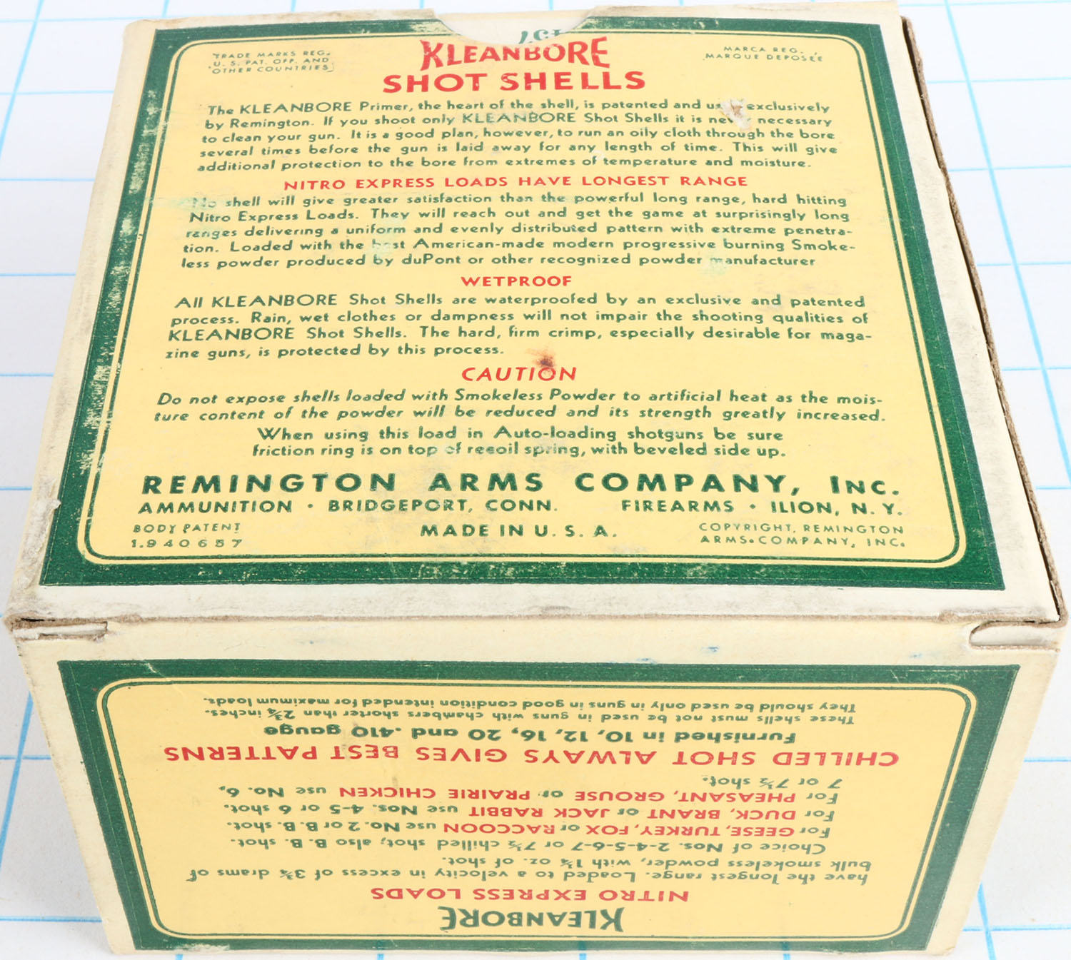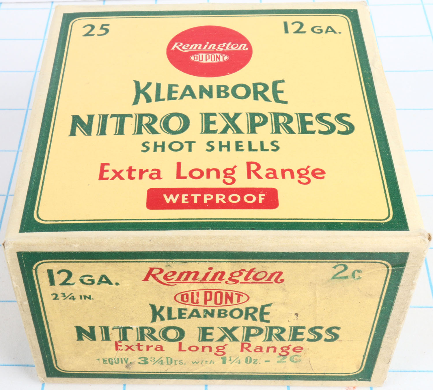 Remington Kleanbore, NITRO EXPRESS, 12ga., 1pc., Full, shot size 2 C, box is yellow, red and green, box is solid with great colors, shells are excellent. Grade: Excellent ++ - Value: 10 to 50