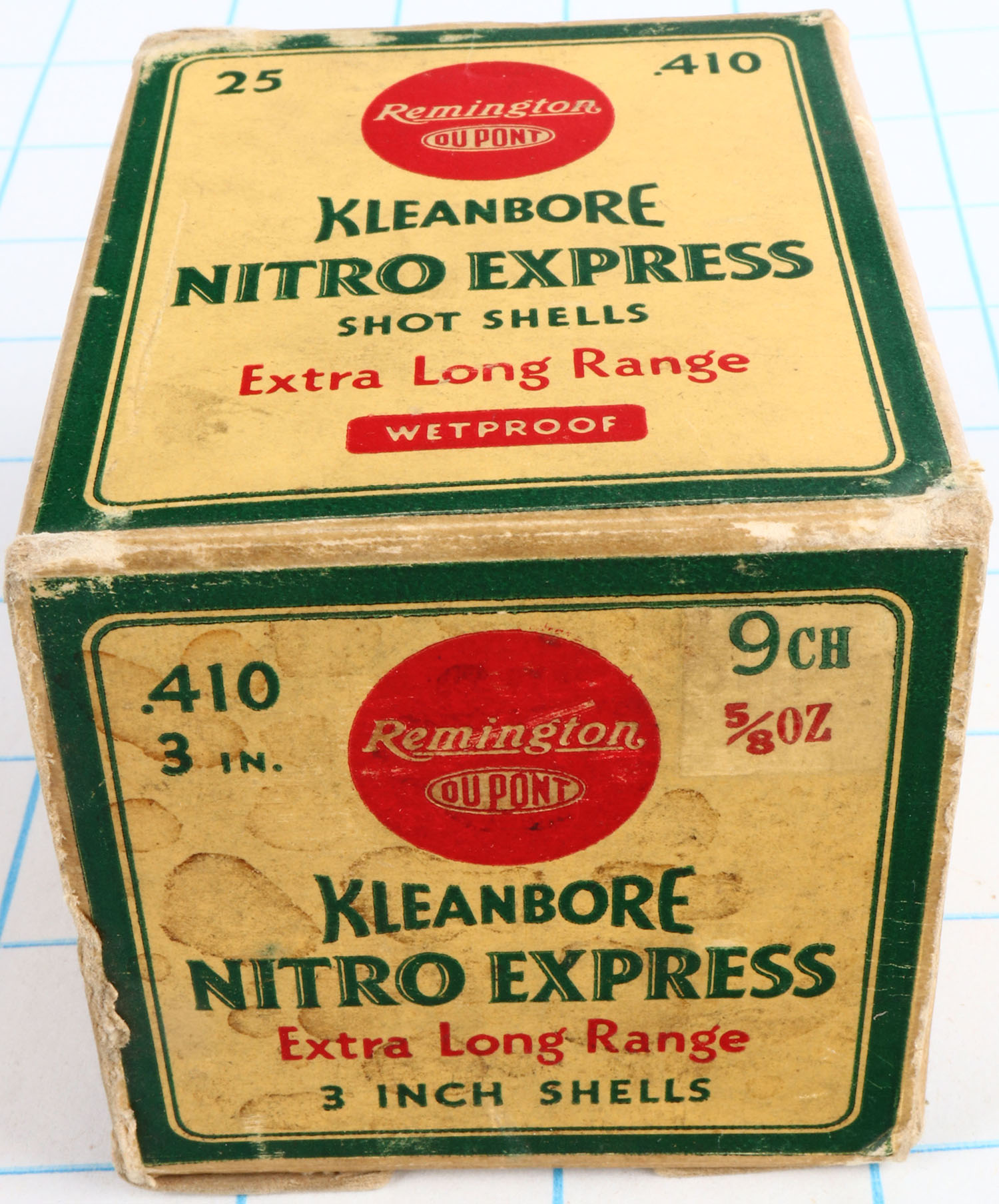 Remington Kleanbore, NITRO EXPRESS, 410ga., 3'', 1pc., Empty, shot size 9 CH, box is yellow, red and green, box has light scuffing & light soiling with very nice colors. Grade: Excellent - Value: 10 to 50