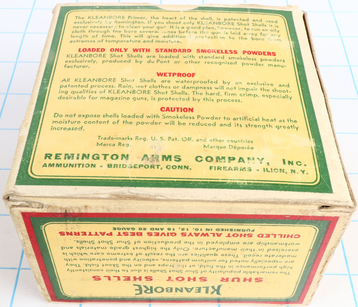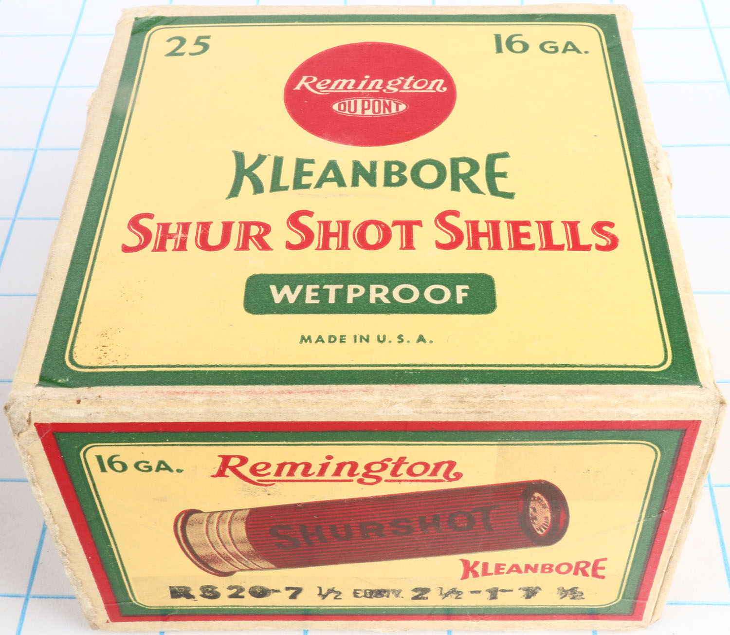 Remington Kleanbore, SHUR SHOT SHELLS, 16ga., 2 5/8'', 1pc., Full, shot size 7 1/2, box is yellow, red and green, box is very solid with great colors & has light edge wear, Shells are excellent. Grade: Excellent + - Value: 10 to 50
