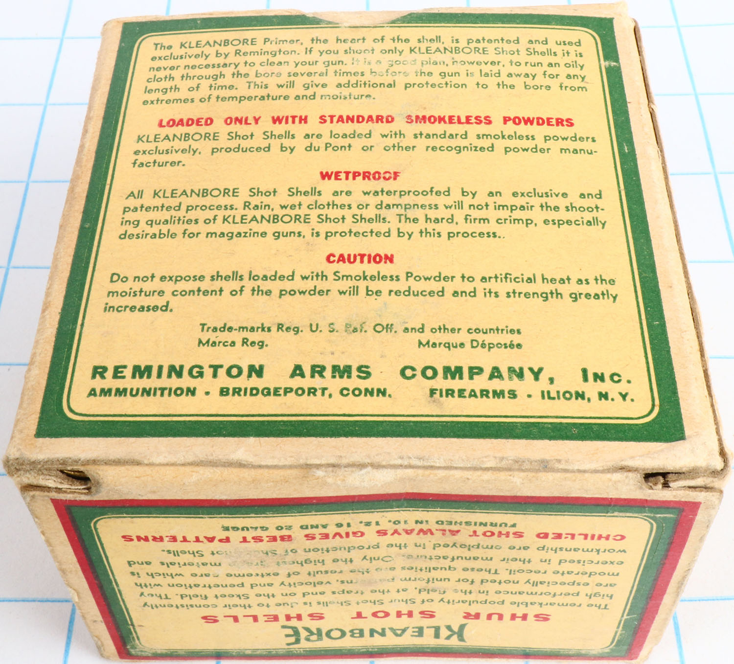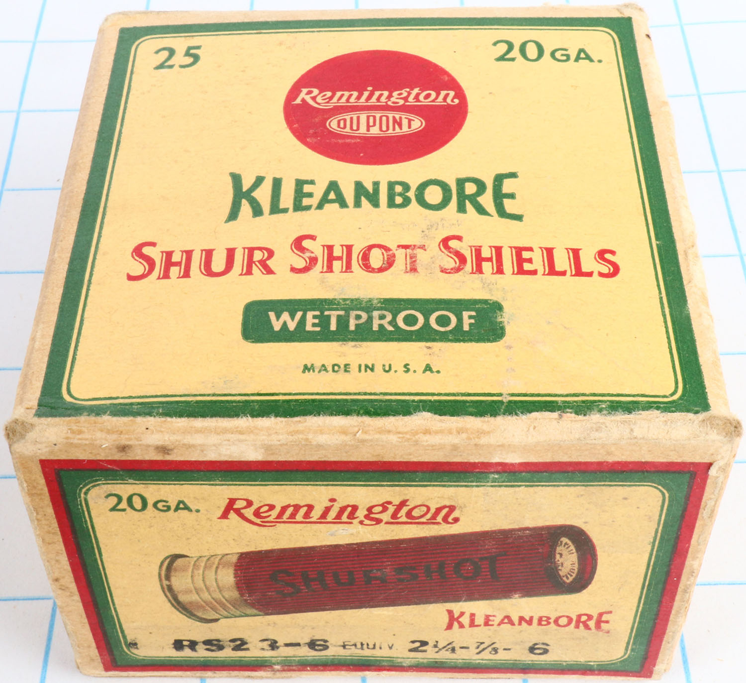 Remington Kleanbore, SHUR SHOT SHELLS, 20ga., 2 1/2'', 1pc., Partial 20rds., shot size 6, box is yellow, red and green, box has light edge wear & light soiling with great colors, Shells are excellent. Grade: Excellent - Value: 10 to 50