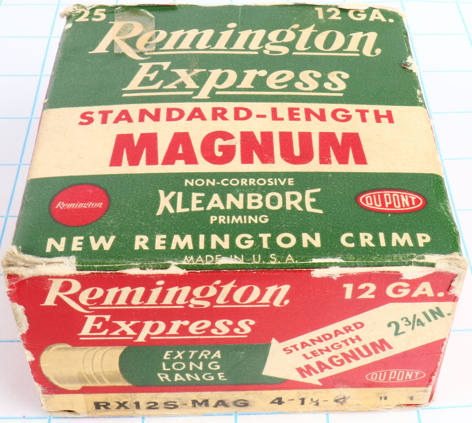 Remington Express, Standard Length Magnum, 12ga., 2 3/4'', 1pc., Empty, shot size 4, box is red, white and green, box has edge wear, light soiling, top flap is disconnected & top inside flap is torn with very nice colors. Grade: Very Good ++ - Value: 10 to 40