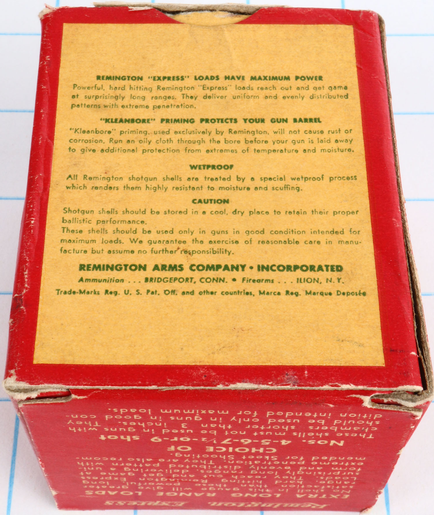 Remington Express, Extra Long Range, 410ga., 1pc., Full, shot size 7 1/2, red, white and green box, 3'', box bottom flap is torn with great colors, shells are excellent. Grade: Excellent - Value: 10 to 50