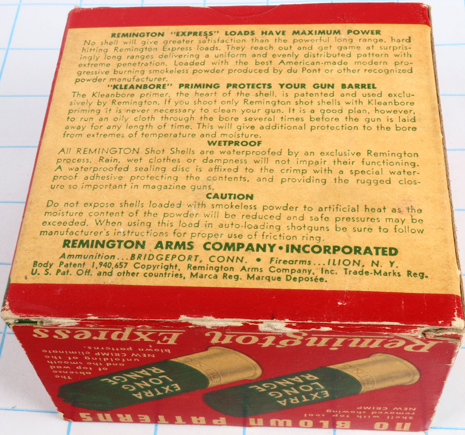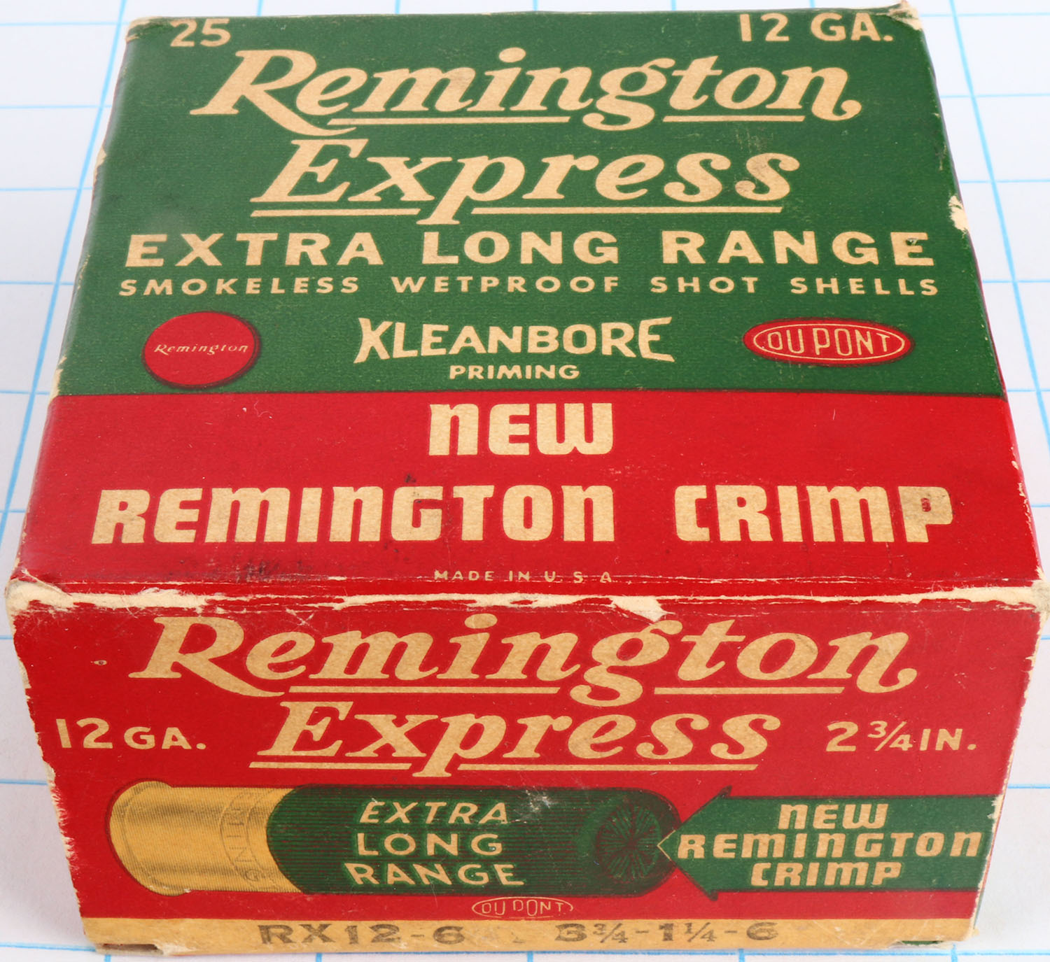 Remington Express, Extra Long Range, 12ga., 2 3/4'', 1pc., Full, shot size 6, box is red, white and green, box is solid with light edge wear & great colors, shells are excellent. Grade: Excellent + - Value: 10 to 30