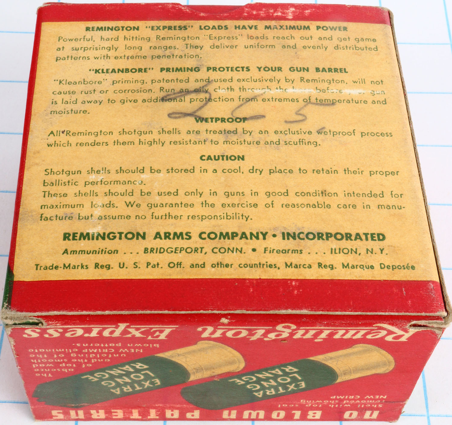Remington Express, Extra Long Range, 12ga., 2 3/4'', 1pc., Partial 4rds all incorrect shot size, shot size 4, box is red, white and green, box is solid with light soiling & great colors, shells are excellent. Grade: Excellent - Value: 10 to 20