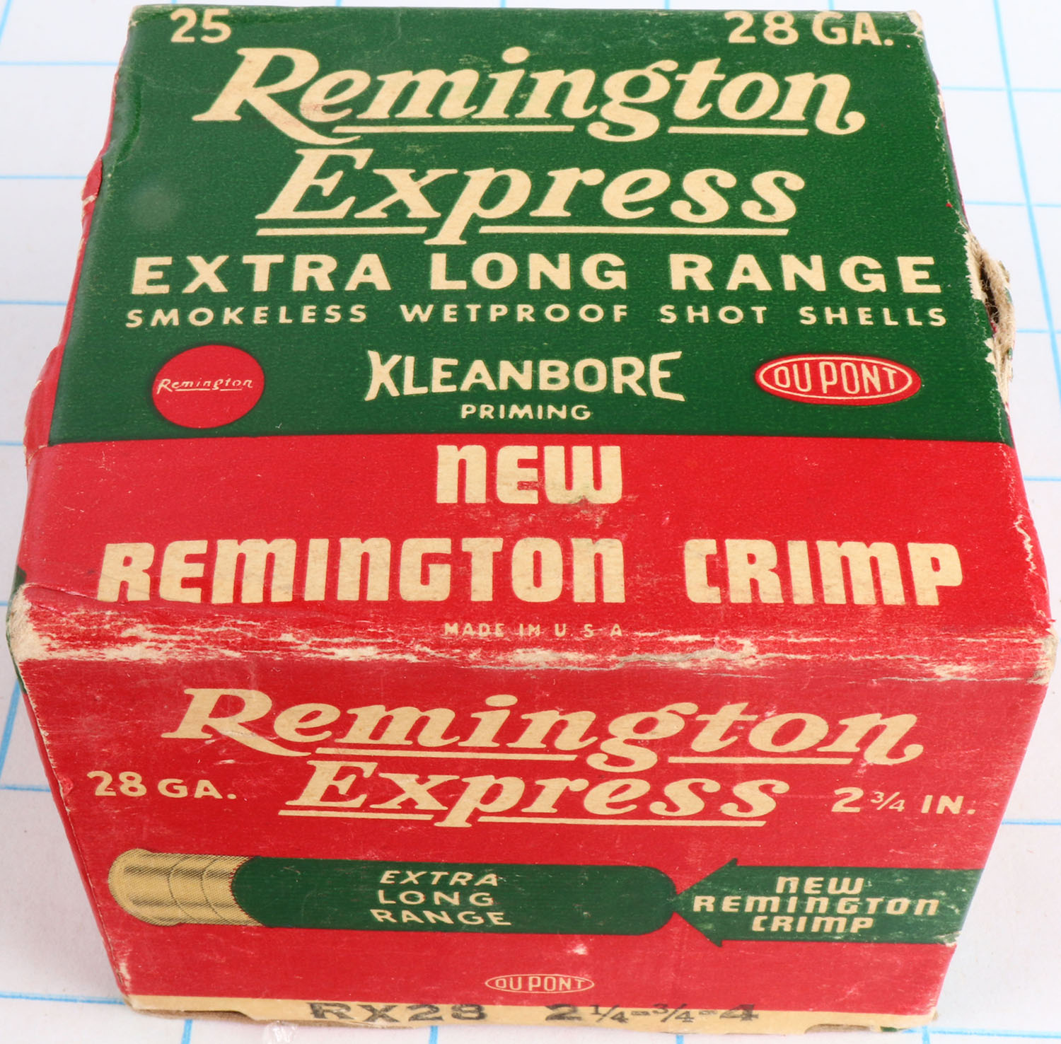 Remington Express, Extra Long Range, 28ga., 2 3/4'', 1pc., Full, shot size 4, red and green box, box has shell protrusions & great colors, shells are excellent. Grade: Very Good ++ - Value: 10 to 30
