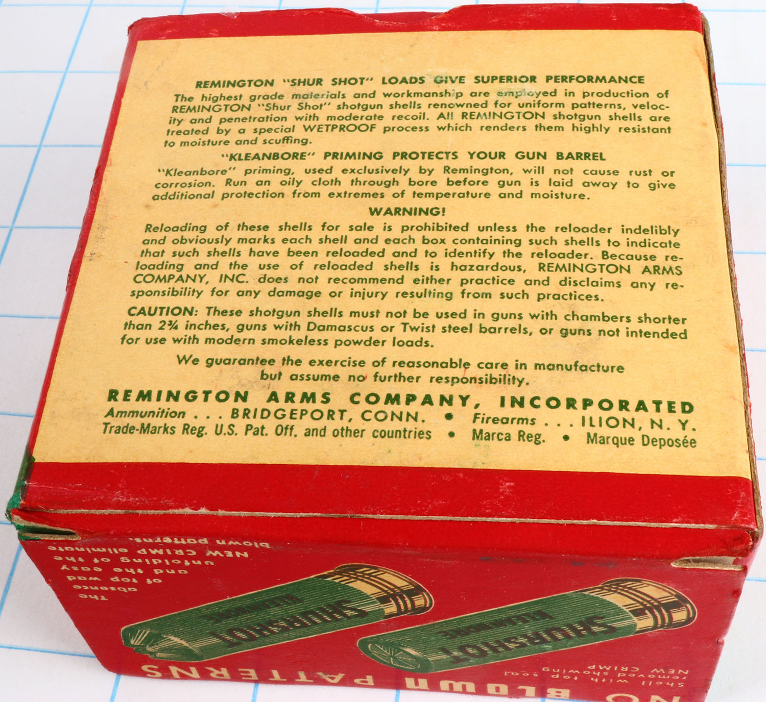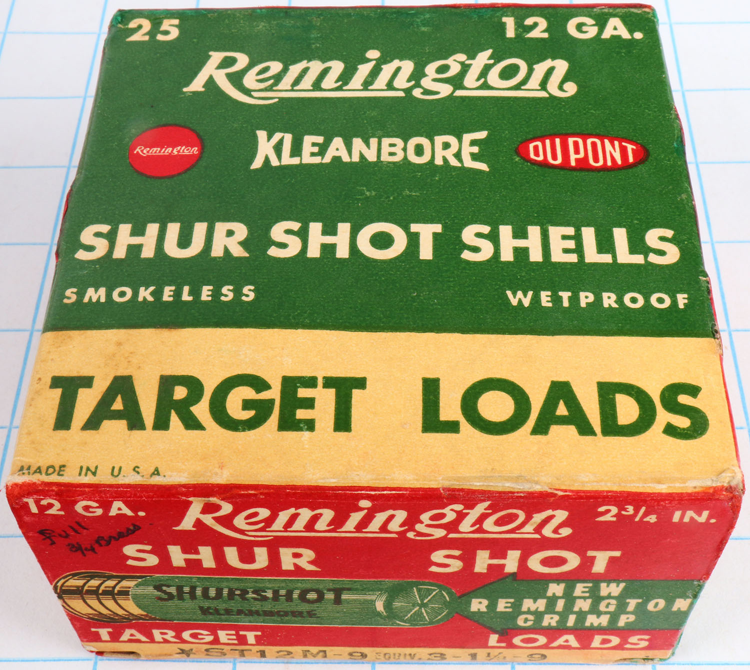 Remington Shur Shot Shells, Target Loads, 12ga., 1pc., Full, shot size 9, red and green box, 2 3/4'', box is solid with shell protrusions that have been repaired with cardboard & great colors, shells are excellent. Grade: Excellent - Value: 10 to 30