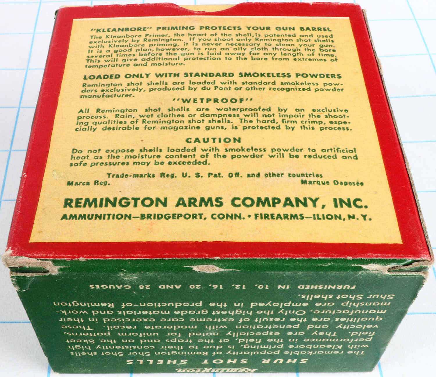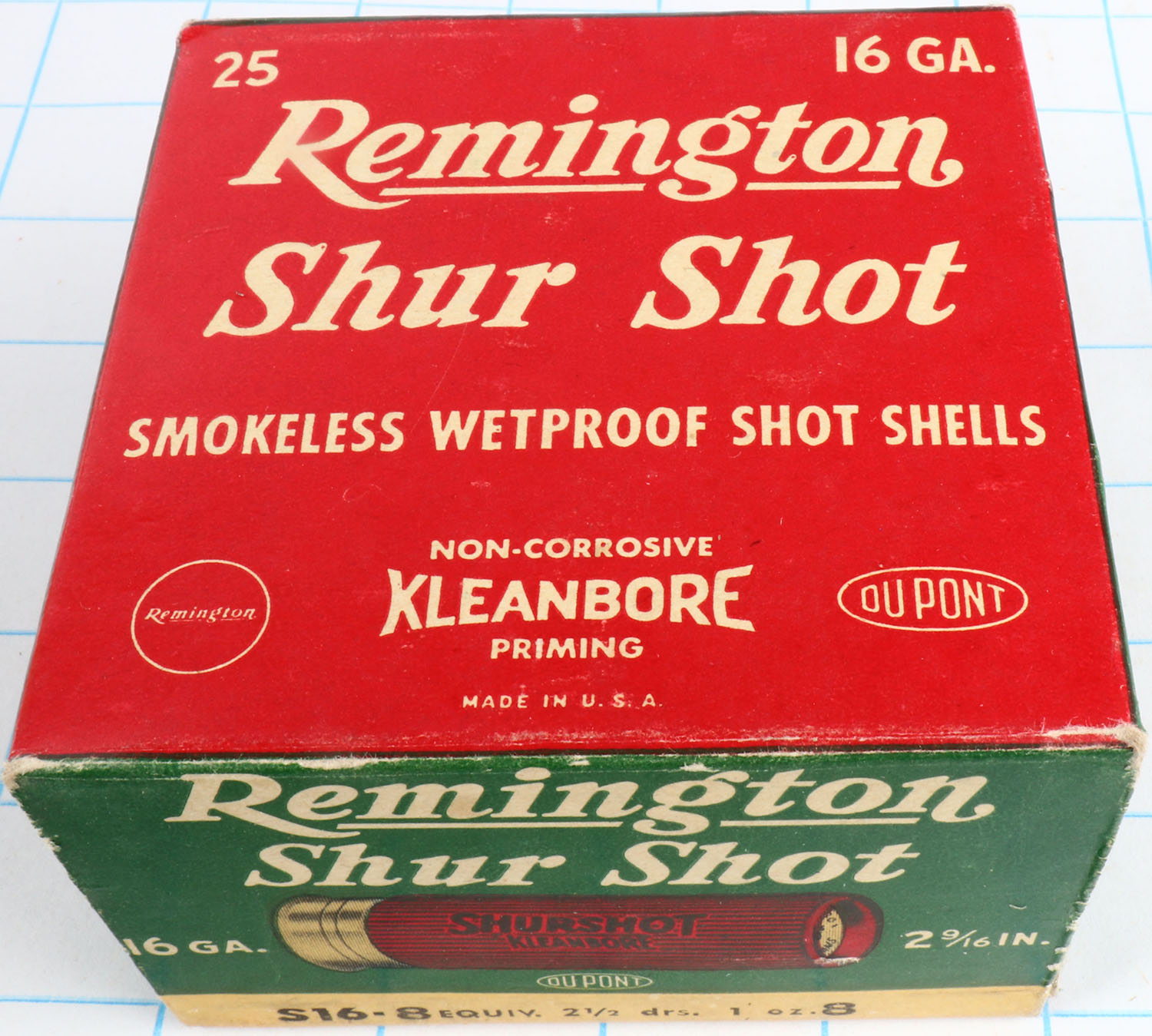Remington Shur Shot, 16ga., 2 9/16'', 1pc., Full, shot size 8, box is red, white and green, box is solid with great colors, shells are excellent. Grade: Excellent ++ - Value: 10 to 30