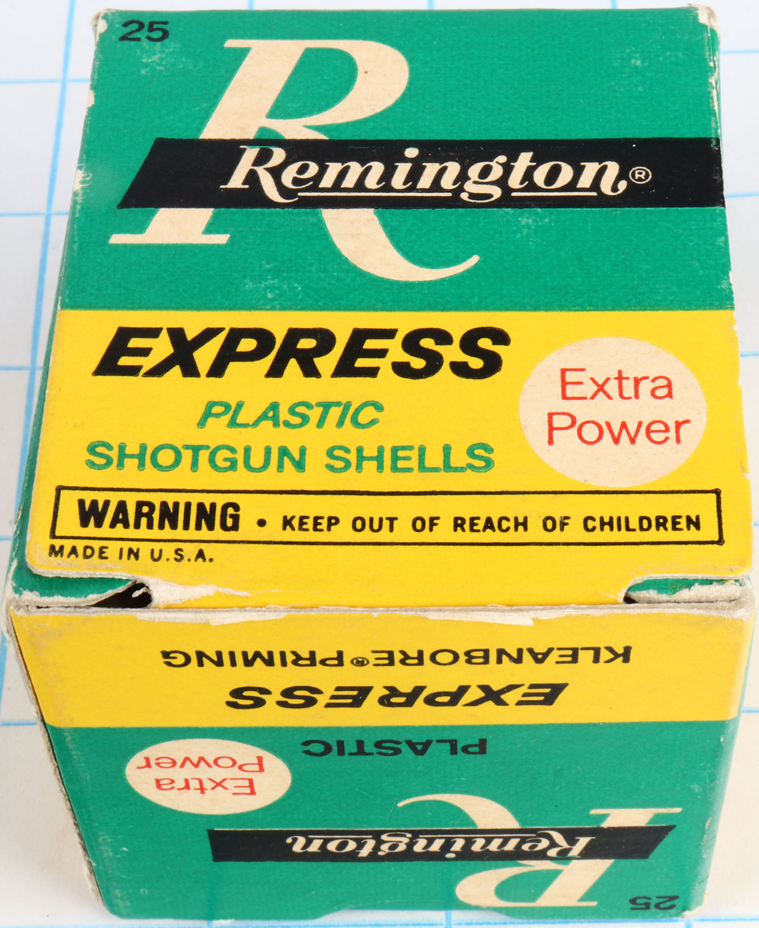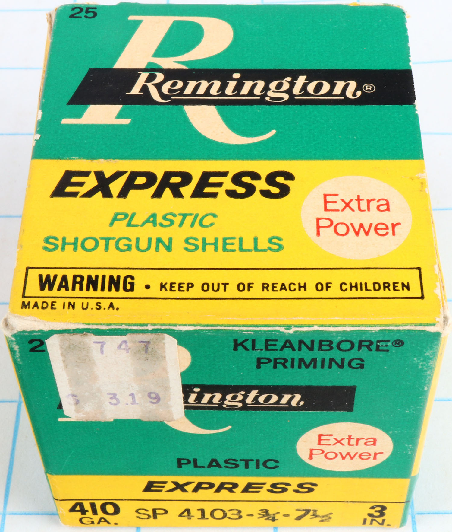 Remington, Express, 410ga., 1pc., Full, shot size 7 1/2, multi-colored box, shells are excellent. Grade: Very Good ++ - Value: 10 to 20