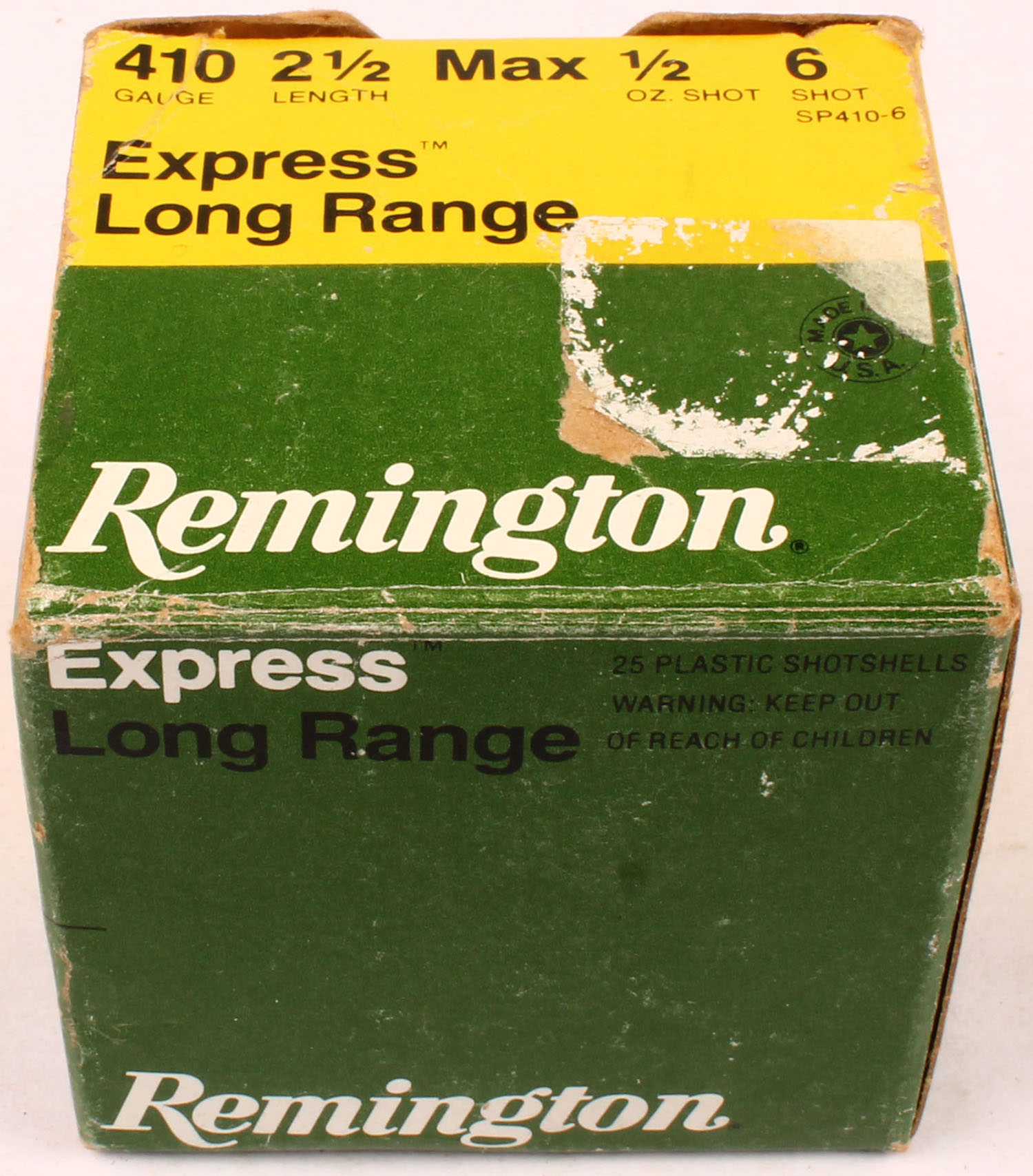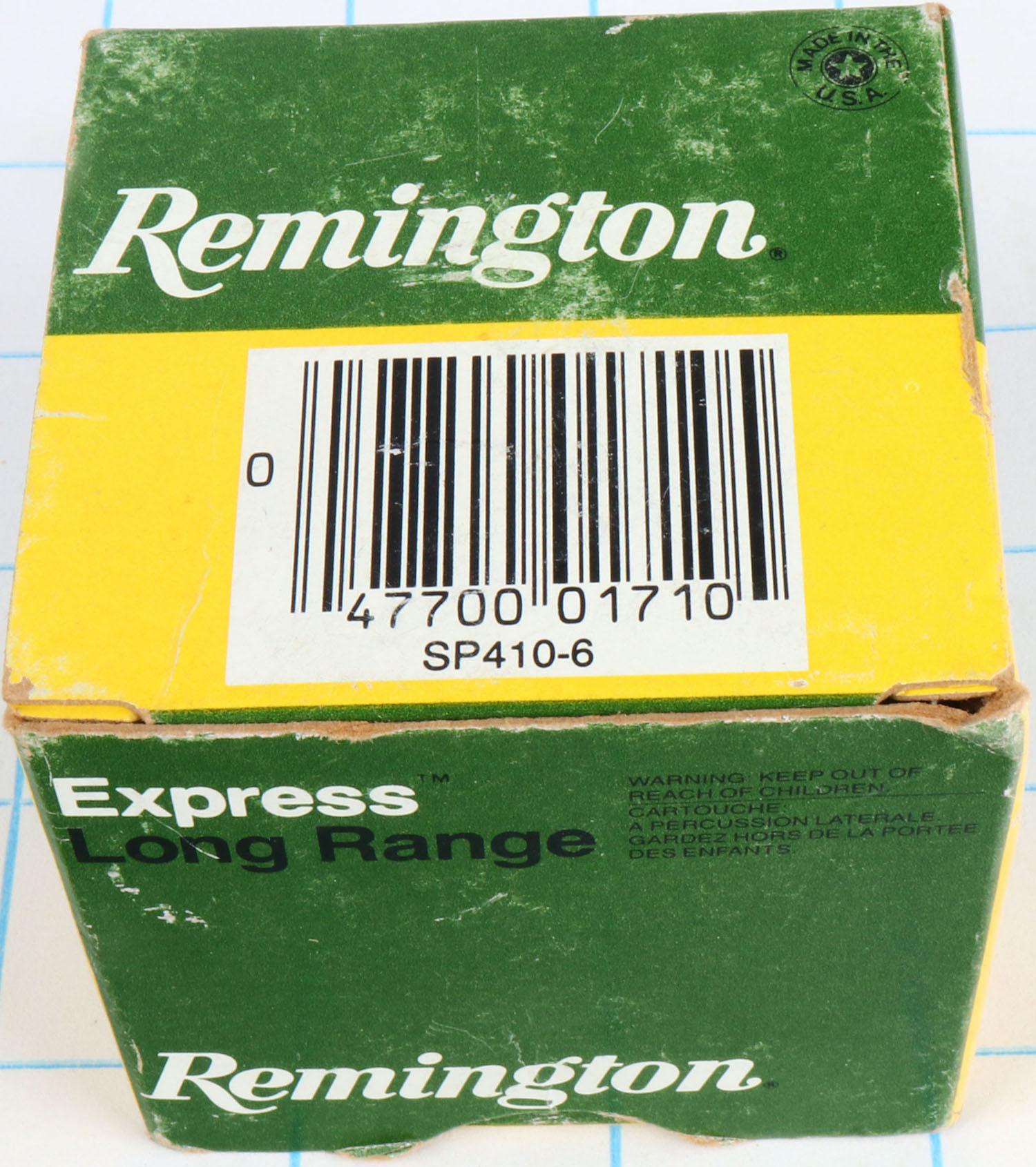 Remington Express, 410ga., 1pc., Full with 16rds being correct shot size, shot size 6, multi-colored box, shells are excellent. Grade: Very Good ++ - Value: 10 to 20