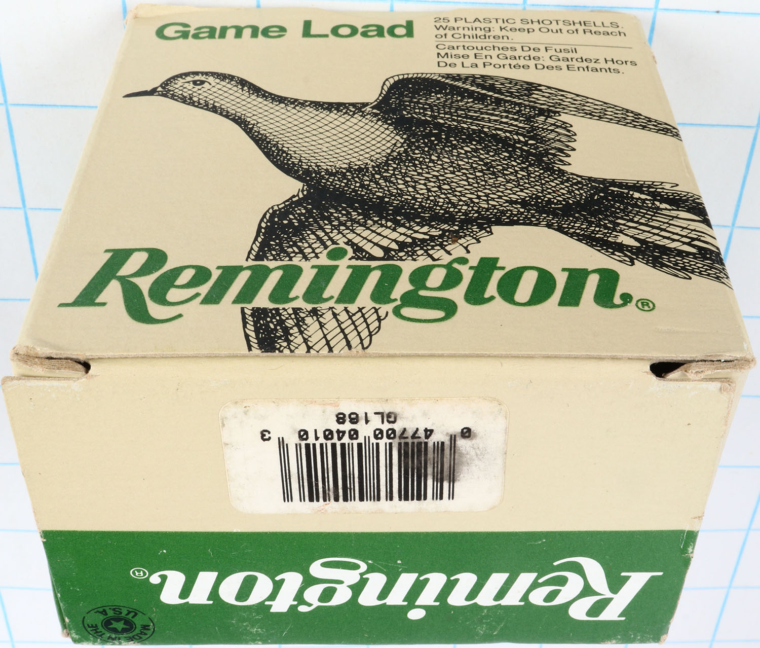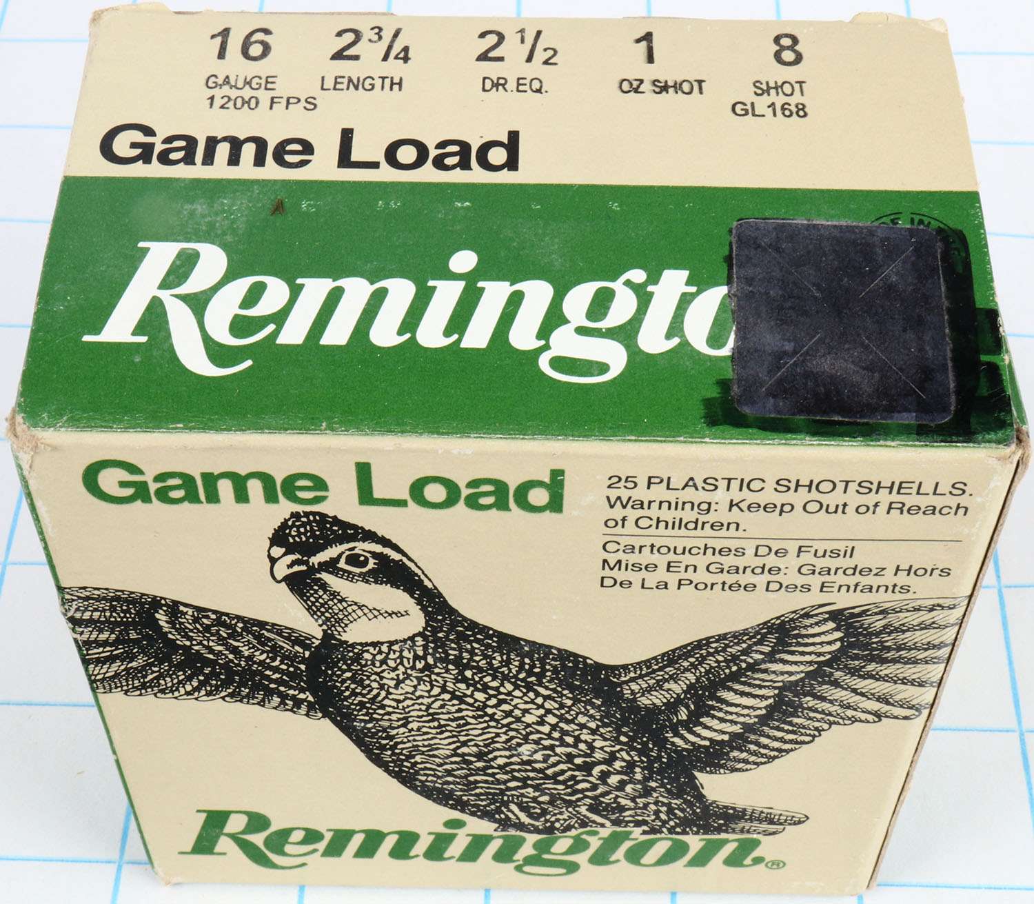 Remington Game Load, 16ga., 1pc., Full, shot size 8, multi-colored box, shells are excellent. Grade: Excellent - Value: 10 to 20
