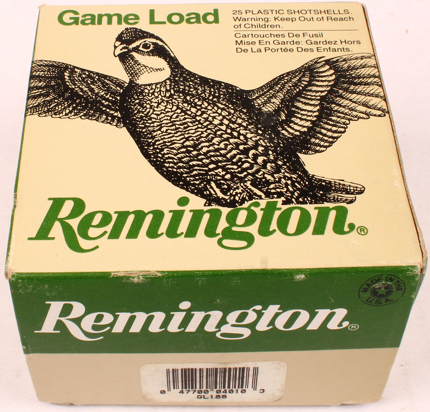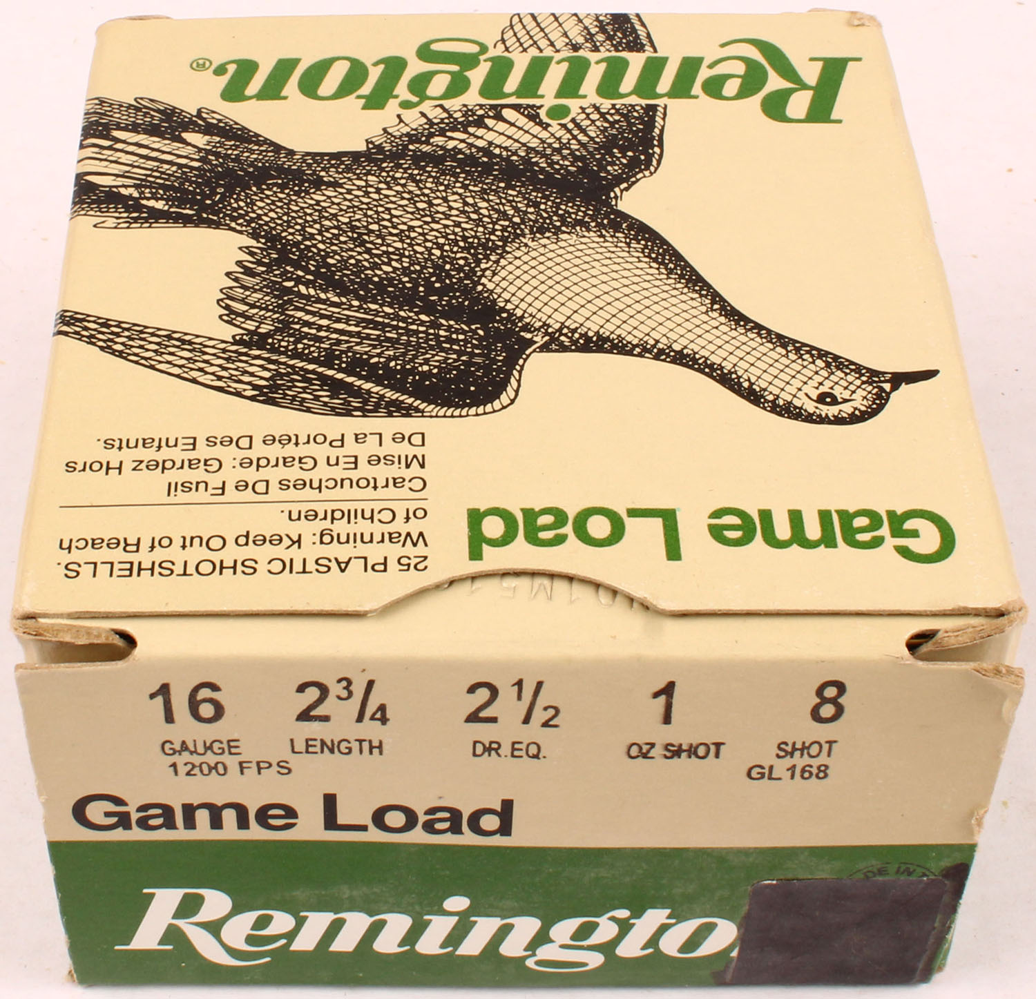 Remington Game Load, 16ga., 1pc., Full, shot size 8, multi-colored box, shells are excellent. Grade: Excellent - Value: 10 to 20