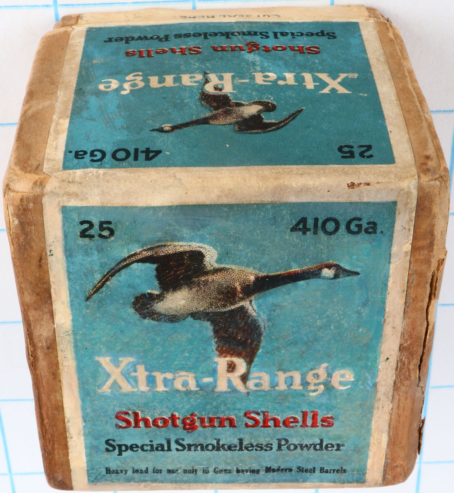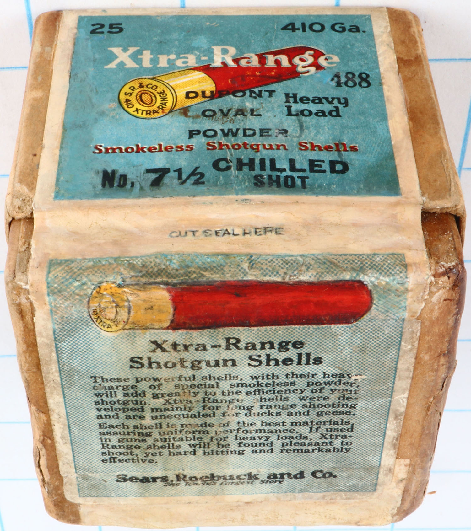Sears Roebuck and Co., XTRA-RANGE, 410ga., 2pc., FULL & Professionally RESEALED, shot size 7 1/2 Chilled Shot, buff box with multi colored label that pictures a Goose flying, box has soiling, light edge wear & has been professionally touched up.* Grade: Excellent - Value: 200 to 600