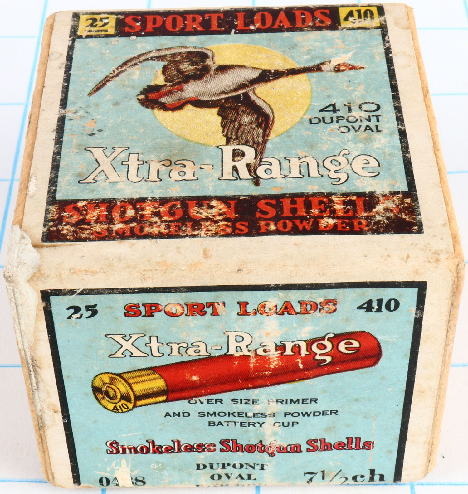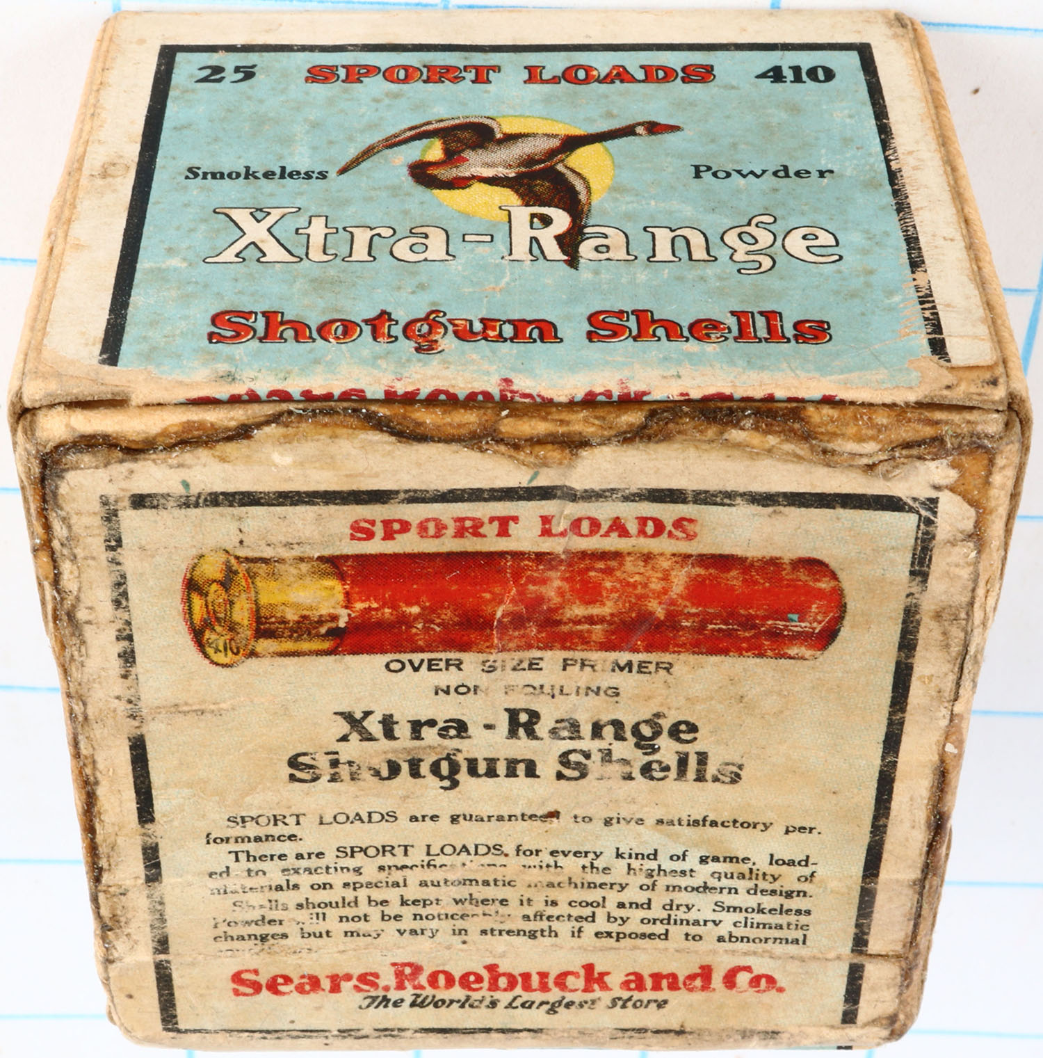 Sears, Sports Loads XTRA-RANGE, 410ga., 2pc., Empty, shot size 7 1/2 ch, buff box with multi colored label that pictures a Goose flying with a yellow moon in background, box is solid with scuffing, glue repair, light soiling & very nice colors. Grade: Very Good ++ - Value: 50 to 250