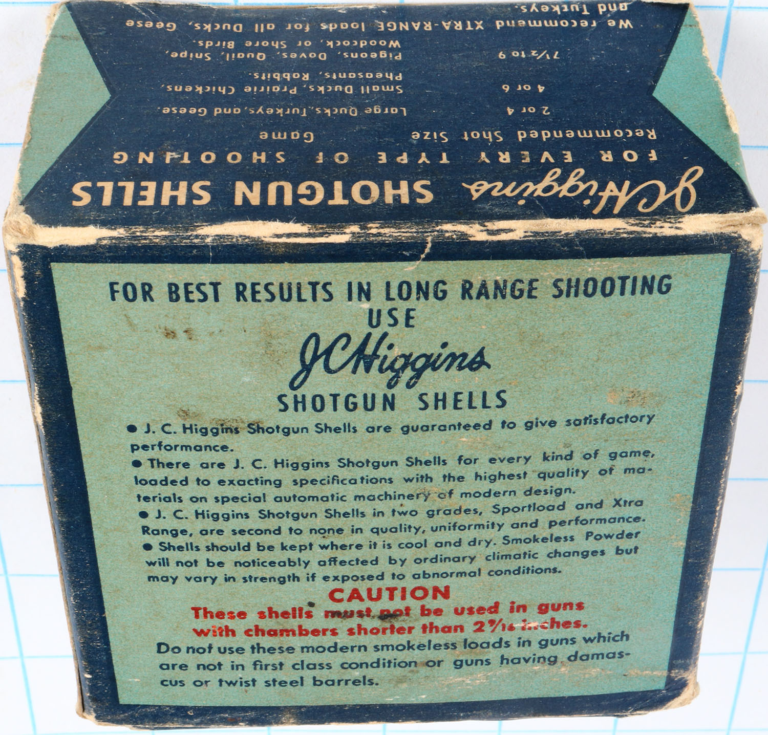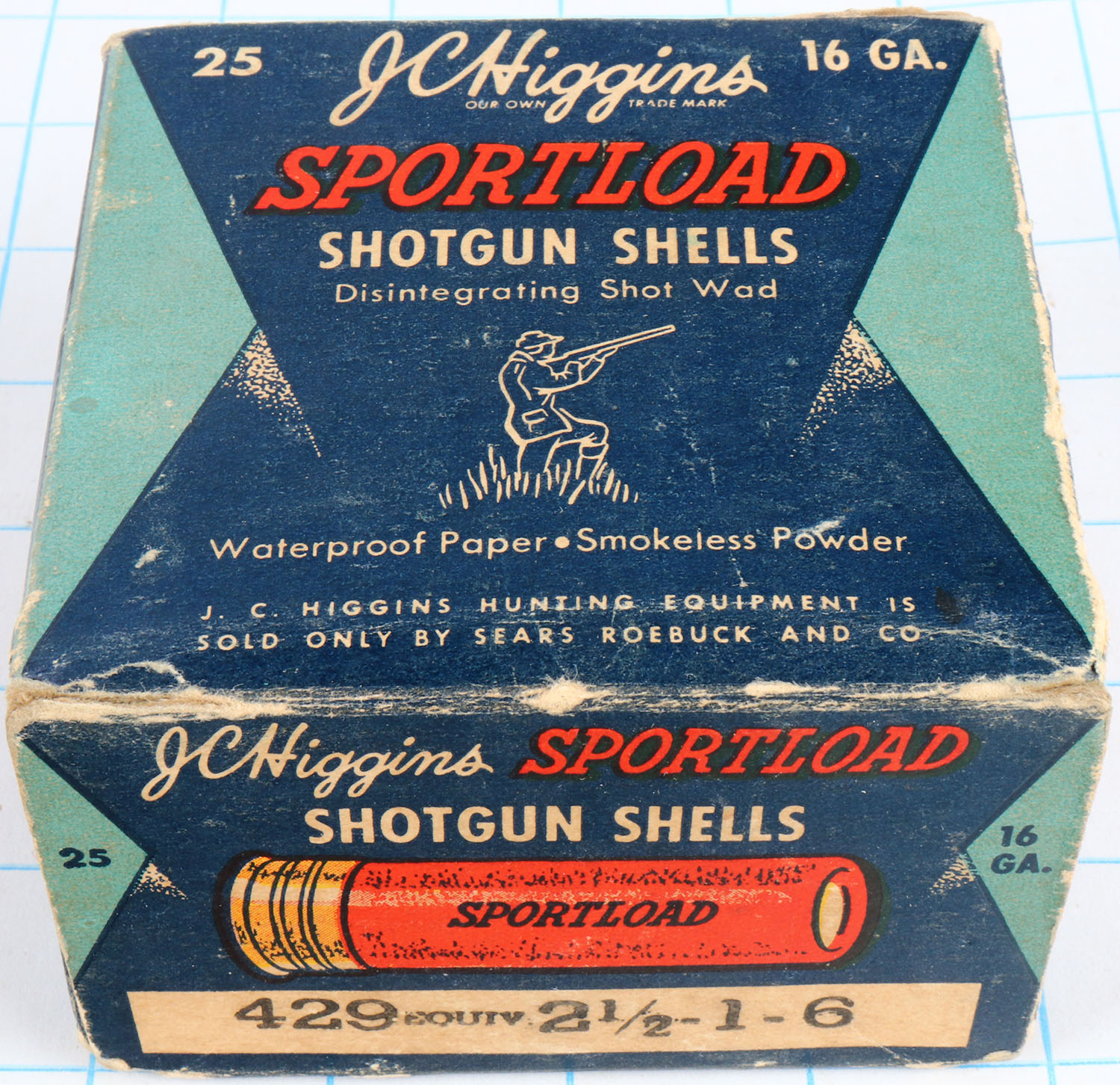 Sears, J.C. Higgins, Sportload, 16ga., 1pc., Partial 20rds with 10rds being Xtra-Range not Sportload, shot size 6, multi-colored box, box has light edge wear, light soiling & tear on top inside flap with great color, Shells are excellent. Grade: Very Good ++ - Value: 10 to 40