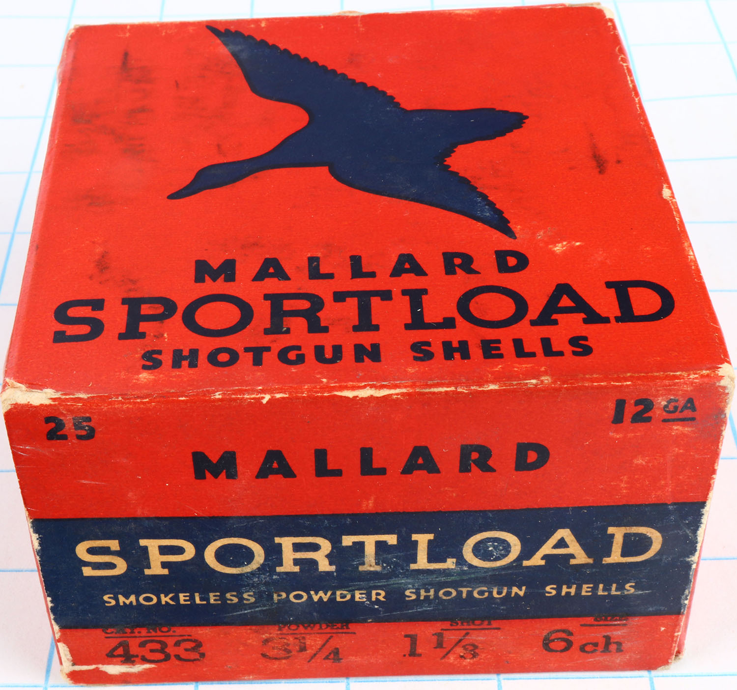 Sears, Sportload MALLARD with insert, 12ga., 1pc., Full, shot size 6 ch, red & blue box that pictures a Mallard in flight, box is solid with light soiling, light edge wear & great colors, shells are very good. Grade: Excellent - Value: 10 to 50