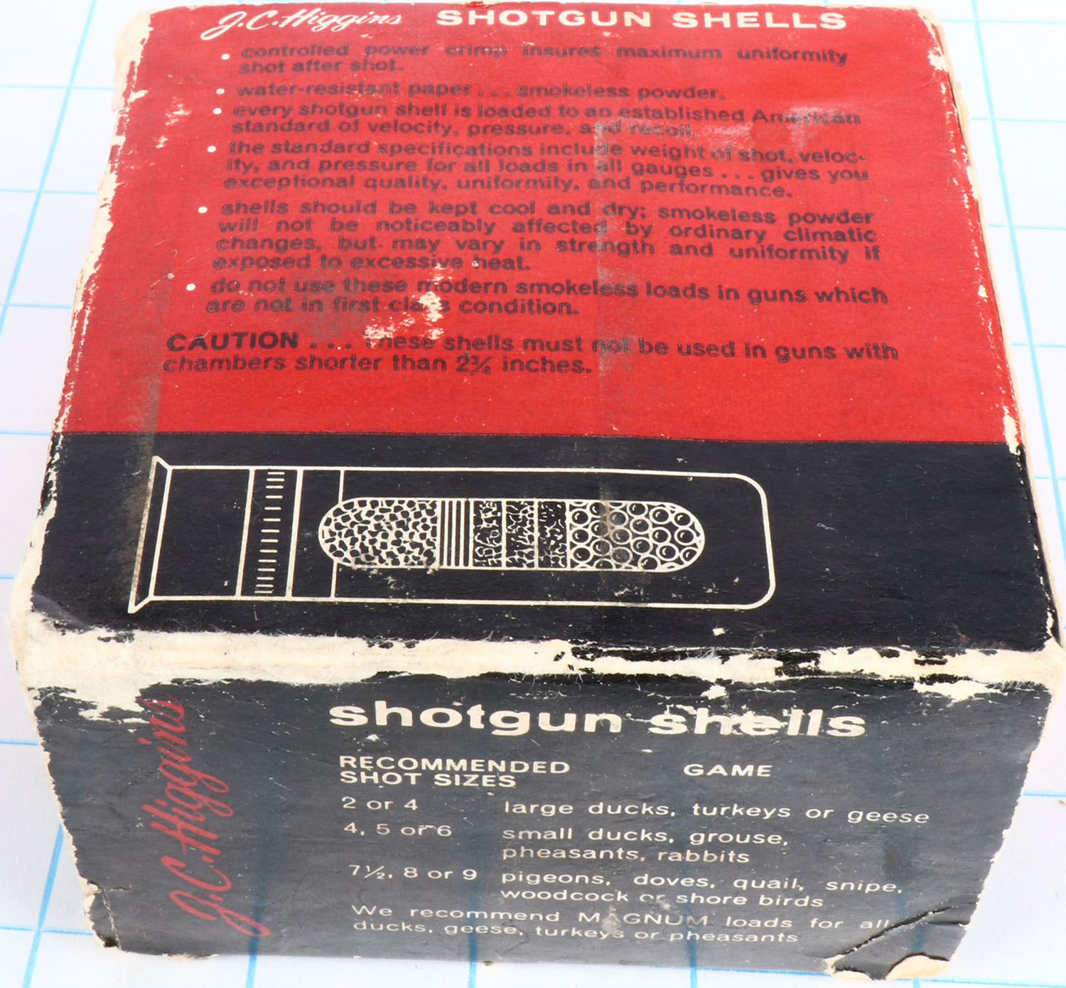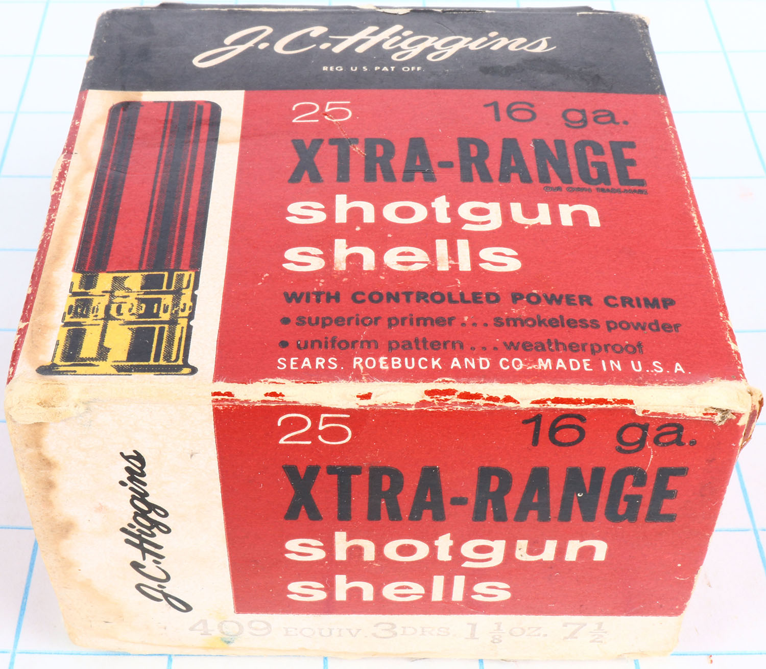 Sears, J.C. HIGGINS, Xtra-Range, 16ga., 1pc., Partial 22rds., Shot Size 7 1/2, box is solid with edge wear, light soiling & very nice colors, shells are excellent. Grade: Excellent - Value: 10 to 30