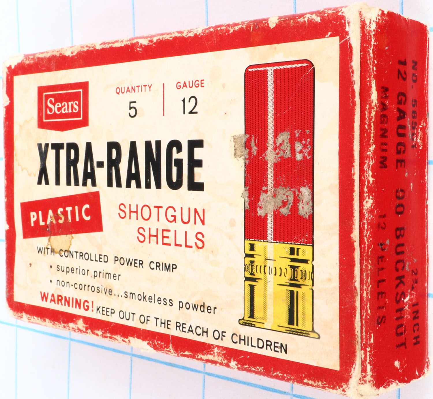 Sears, Xtra-Range, 12ga., 1pc., Partial 3rds, Shot Size 00 Buckshot Magnum, box has edge wear, light soiling & nice colors, shells are excellent. Grade: Very Good ++ - Value: 2 to 10