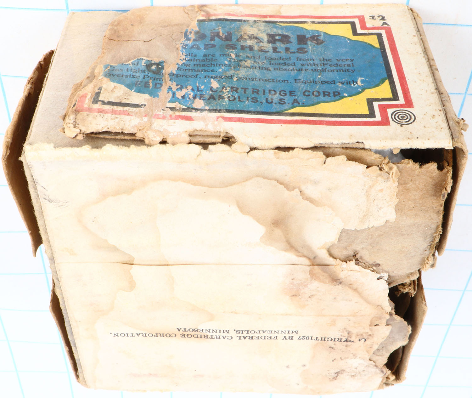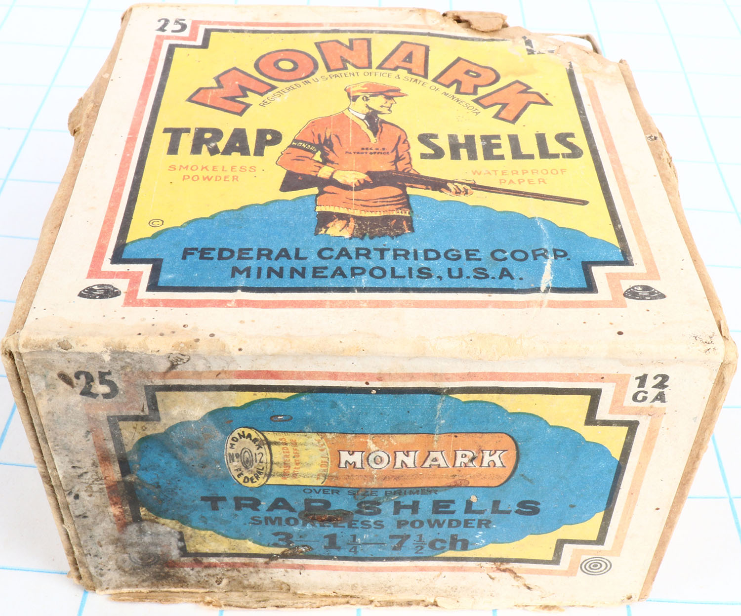Federal, MONARK TRAP SHELLS, 12ga., 2pc., Empty, shot size 7 1/2 ch, buff box with yellow, blue, orange, red & black label, box has edge wear, seam splits, soiling & missing parts of box with nice label, RARE BOX. Grade: Good ++ - Value: 40 to 200