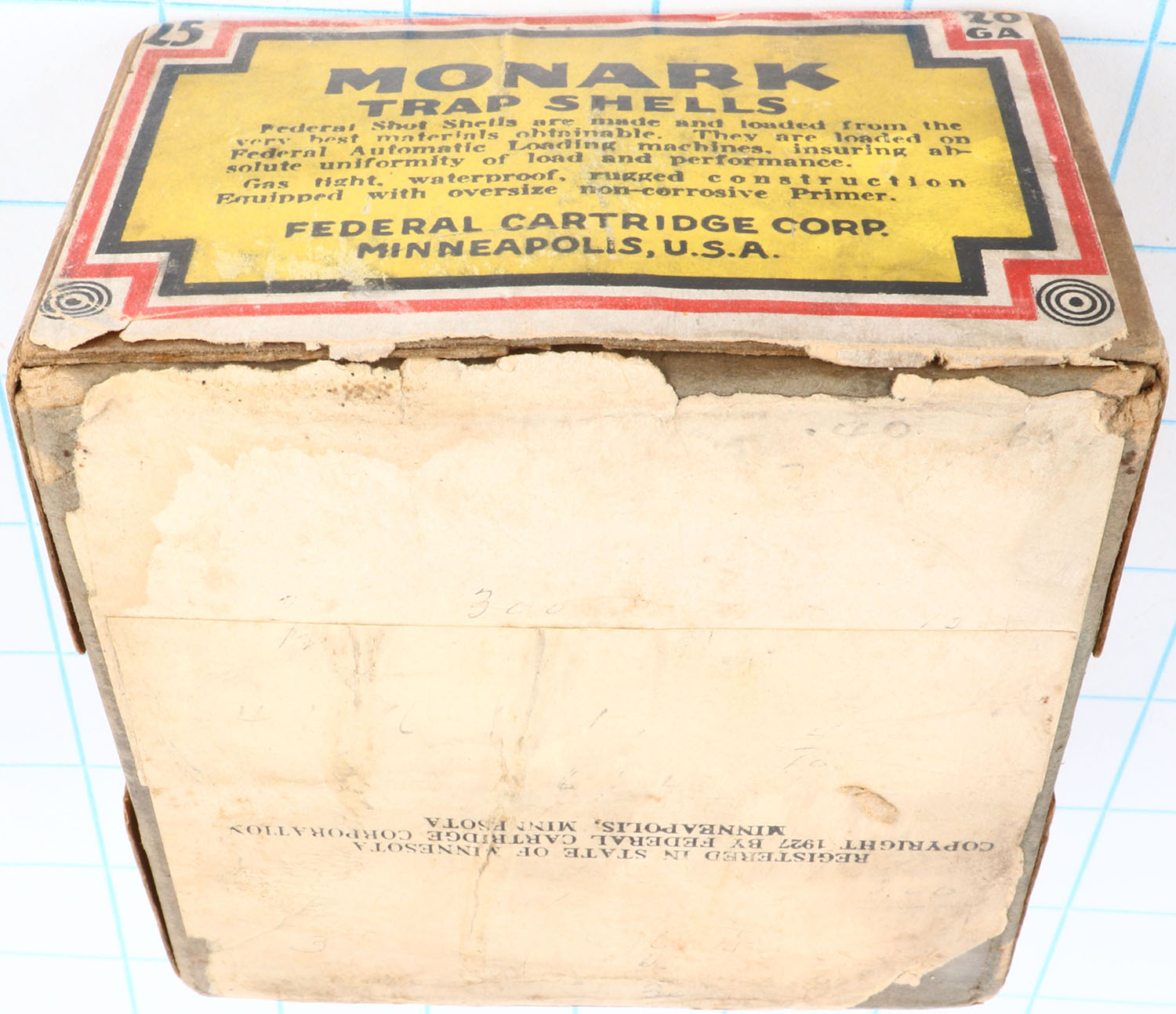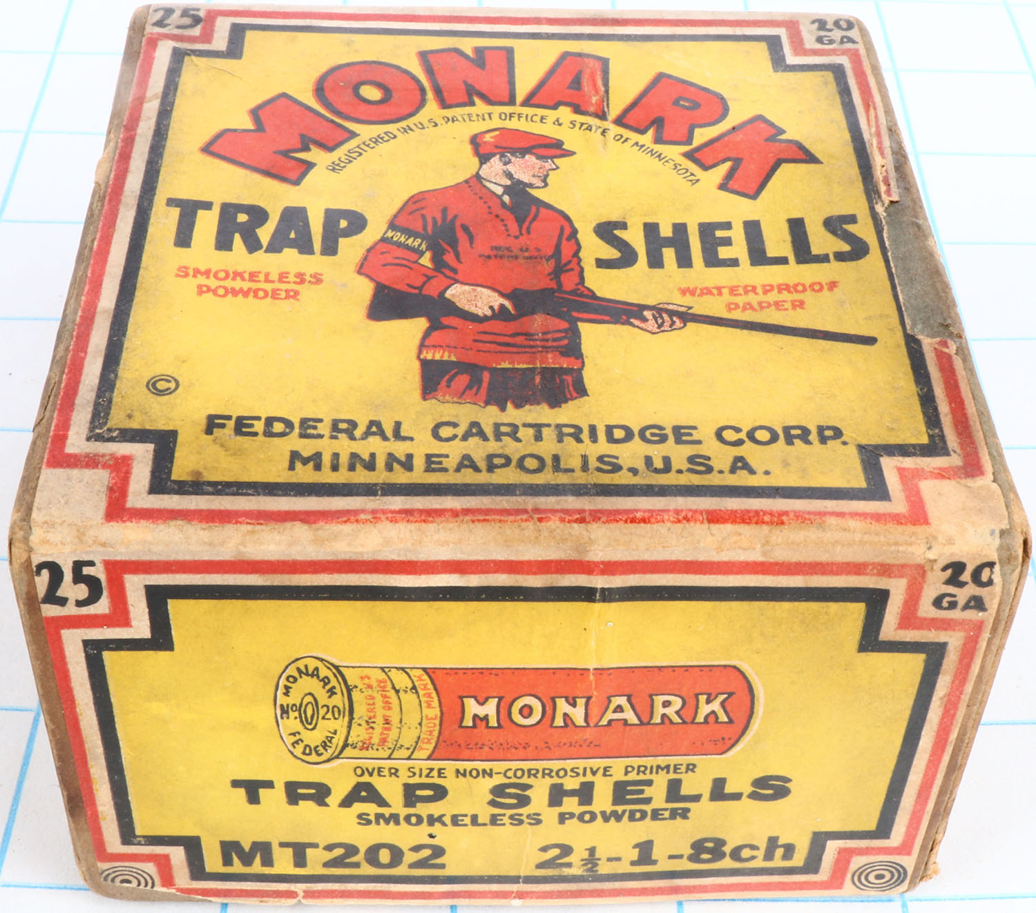 Federal, MONARK TRAP SHELLS, 20ga., 2pc., Empty, shot size 8ch, blue box with yellow, orange, red & black label showing trap shooter, box has great label with light soiling & light edge wear, RARE BOX. Grade: Excellent + - Value: 200 to 500