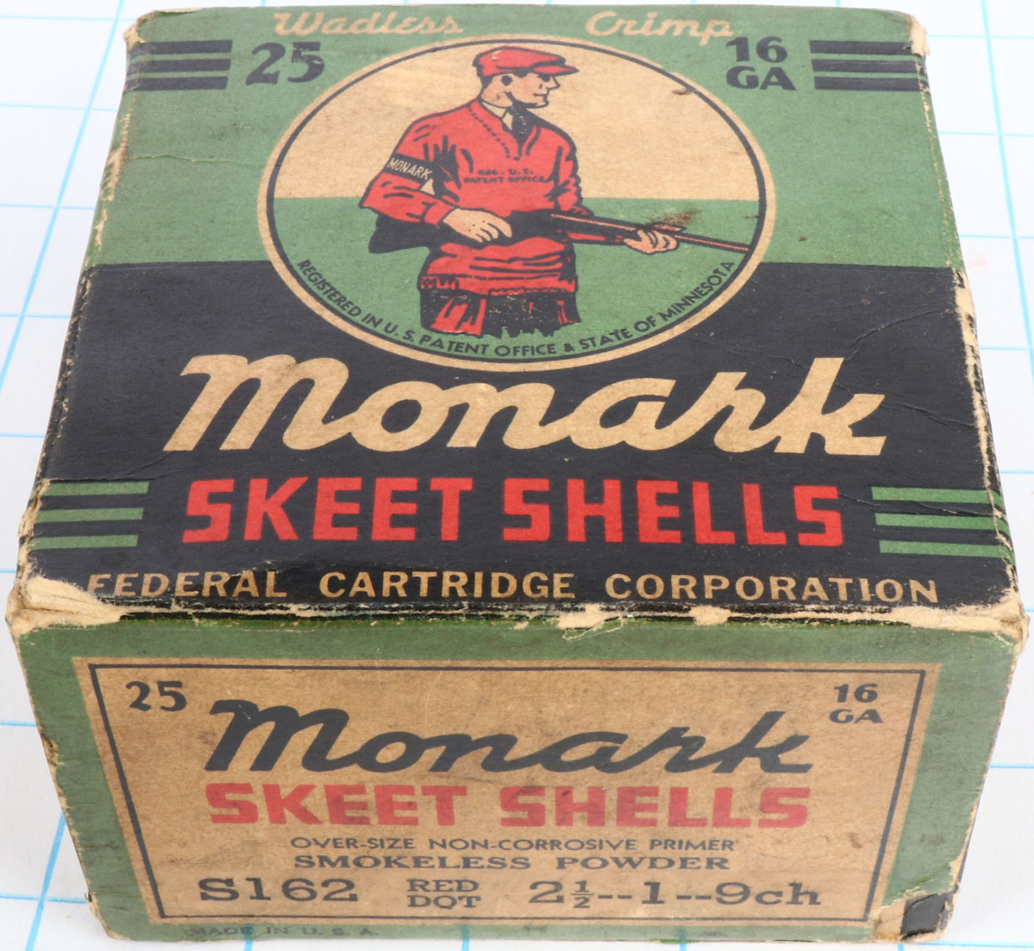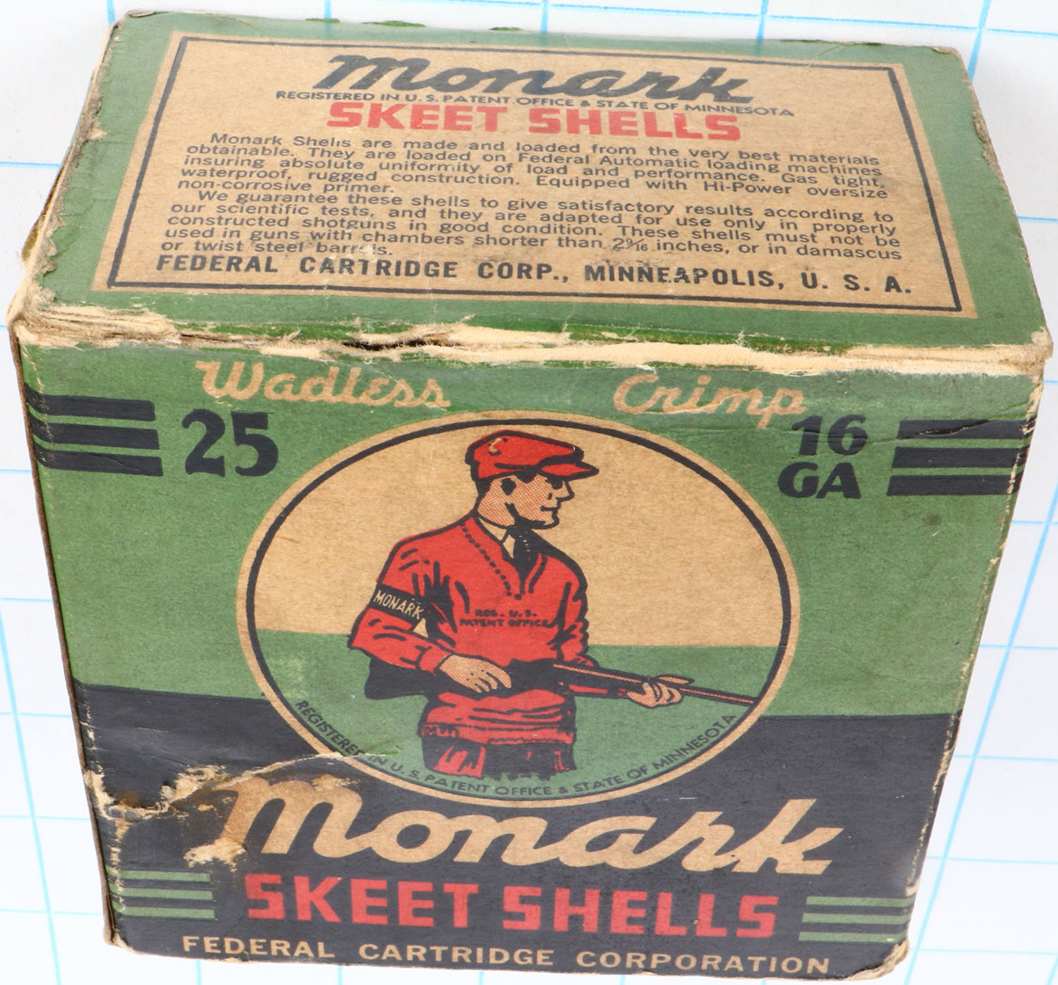 Federal Monark, Skeet Shells, 12ga., 1pc., Partial 10rds., shot size 9ch, green, red & black box that pictures trap shooter with red sweater & cap, box top flap is disconnected, box bottom inside flap is torn, box has light soiling, light age soiling & very nice colors, Shells are excellent. Grade: Very Good ++ - Value: 20 to 50