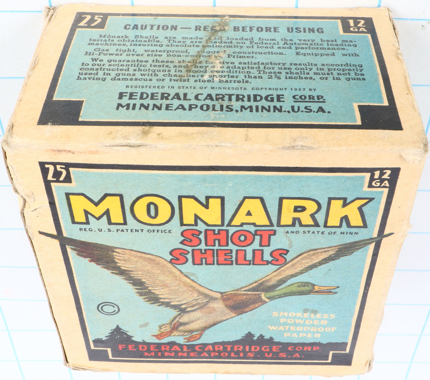 Federal Cart. Co., MONARK U.S. Property, 12ga., 1pc., Full, shot size 8ch, Black border, blue, yellow and red box with flying mallard, box has light soiling & light edge wear with great color, shells are excellent. Grade: Excellent - Value: 10 to 40