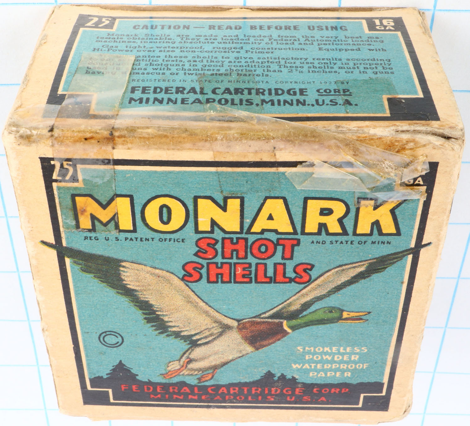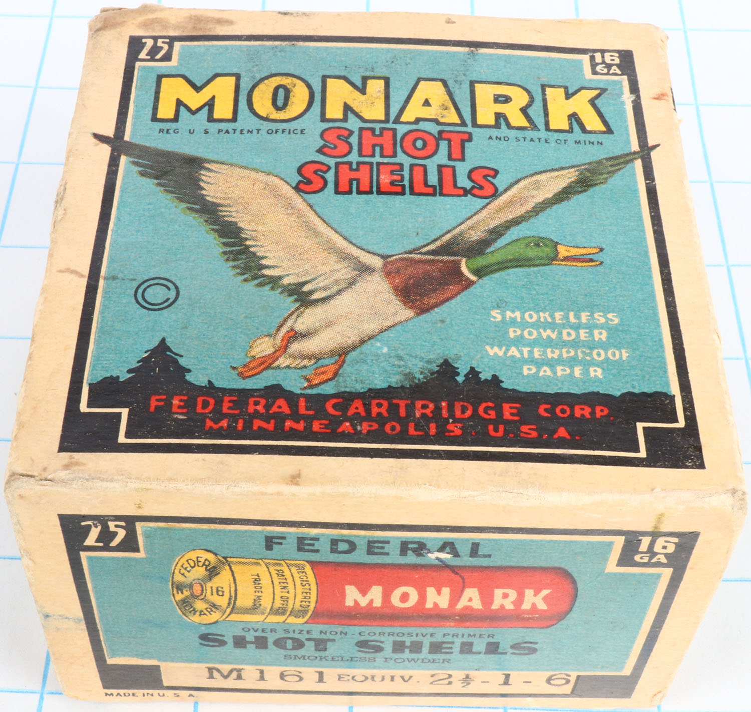 Federal Cart. Co., MONARK, 16ga., 1pc., Full, shot size 6, Black border, blue, yellow and red box with flying mallard, box has light edge wear, tape repair & torn top flap with great color, Shells are excellent. Grade: Excellent - Value: 10 to 40