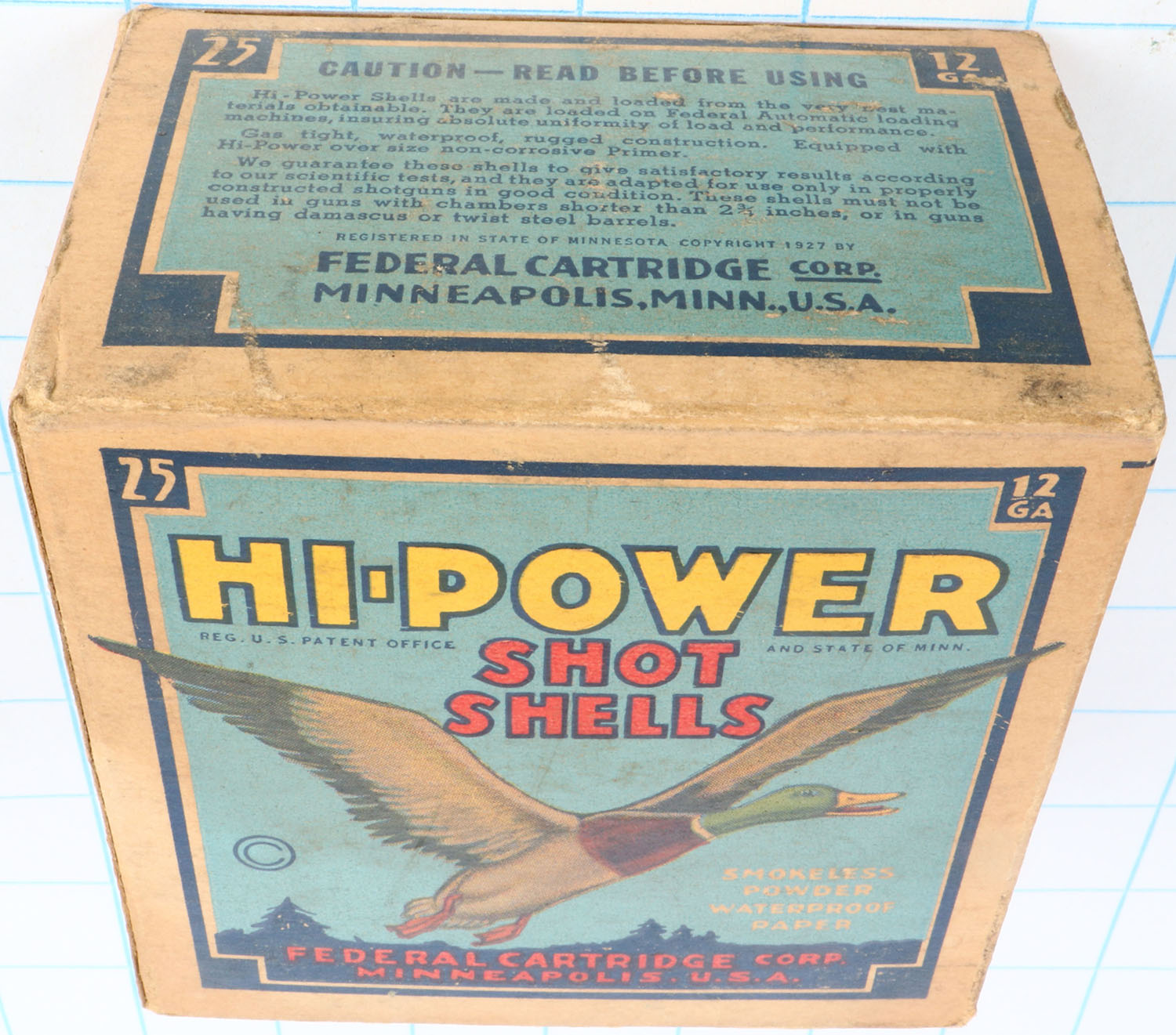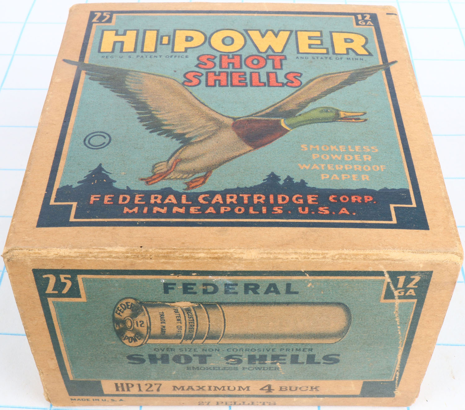 Federal Cart. Co., HI-POWER, 12ga., 1pc., Empty, shot size 4 Buck, Blue border, blue, yellow and red box with flying mallard, box has age soiling to bottom & light scuffing with great color. Grade: Excellent - Value: 10 to 40