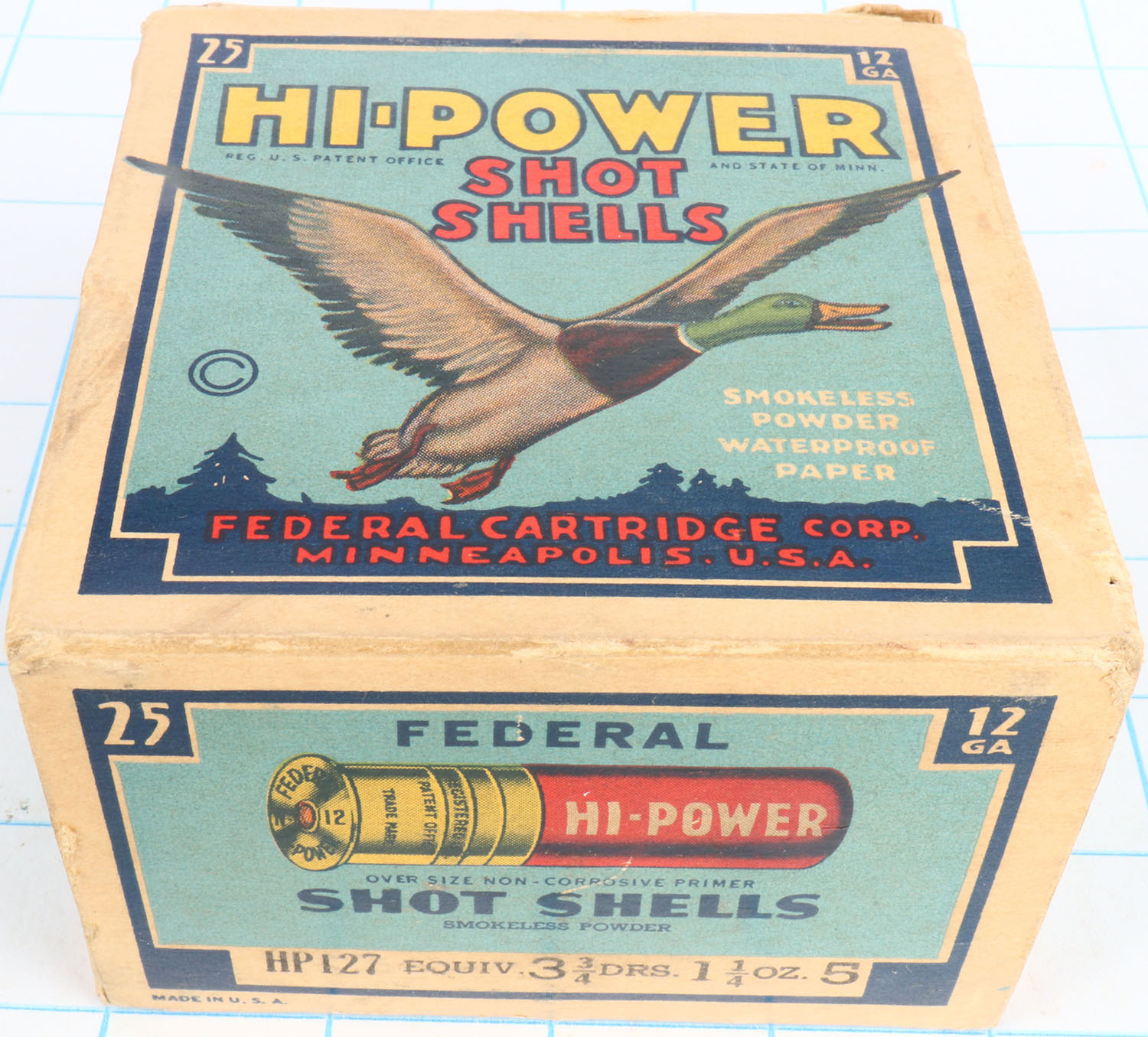 Federal Cart. Co., HI-POWER, 12ga., 1pc., Full, shot size 5, Blue border, blue, yellow and red box with flying mallard, box is very solid with small tear & great color, Shells are excellent. Grade: Excellent + - Value: 10 to 40