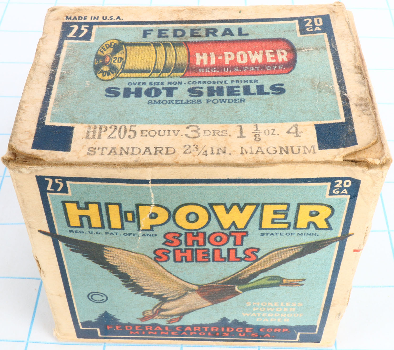 Federal Cart. Co., HI-POWER, 20ga., 1pc., Empty, shot size 4 Magnum, Blue border, blue, yellow and red box with flying mallard, box has light edge wear & light soiling with very nice color. Grade: Excellent - Value: 10 to 40