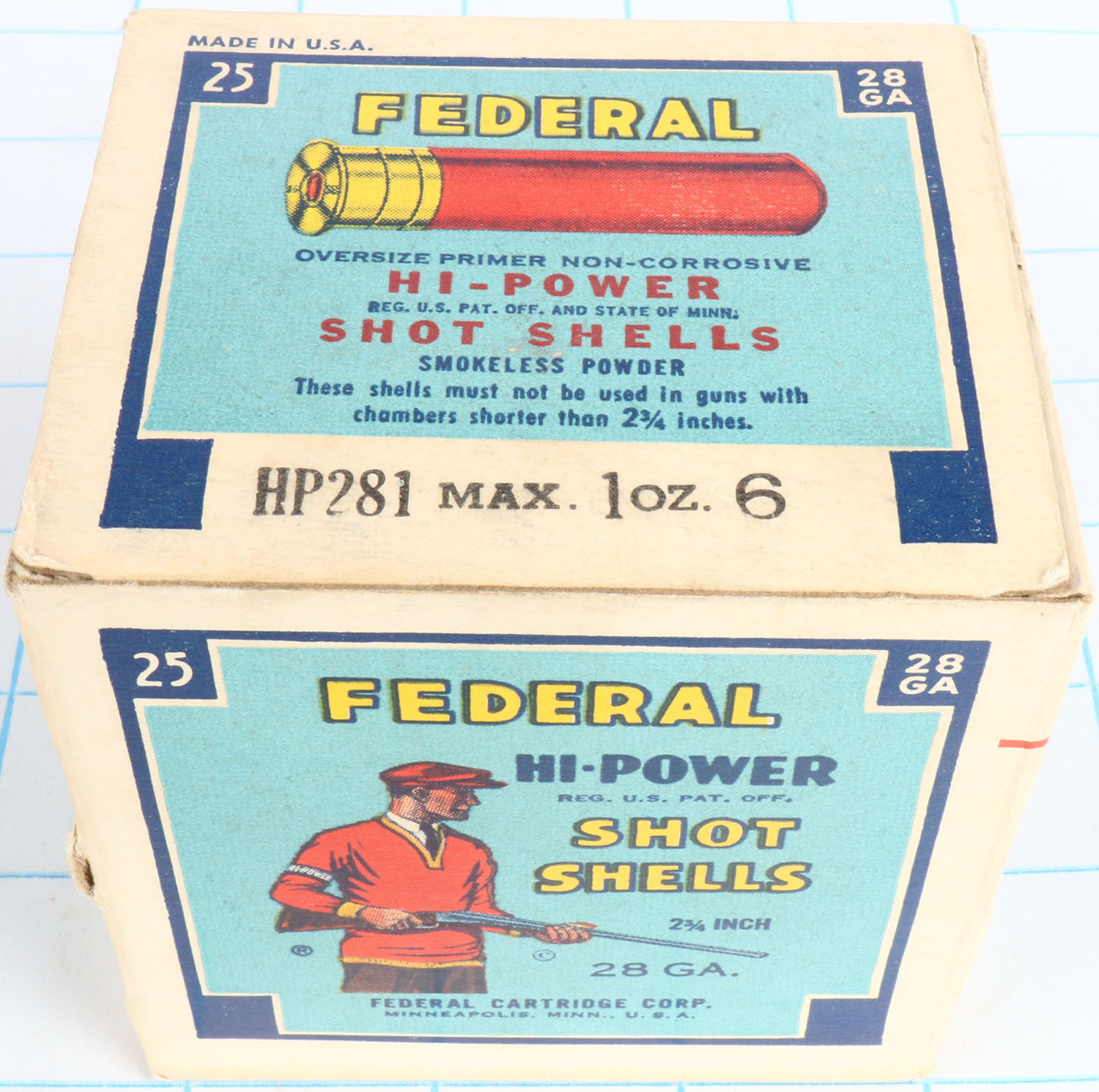 Federal Cart. Co., HI-POWER with Insert, 28ga., 1pc., Full, shot size 6, Blue border, blue, yellow and red box with Trap Shooter, box has shell protrusions with great color, shells are excellent. Grade: Excellent + - Value: 20 to 60