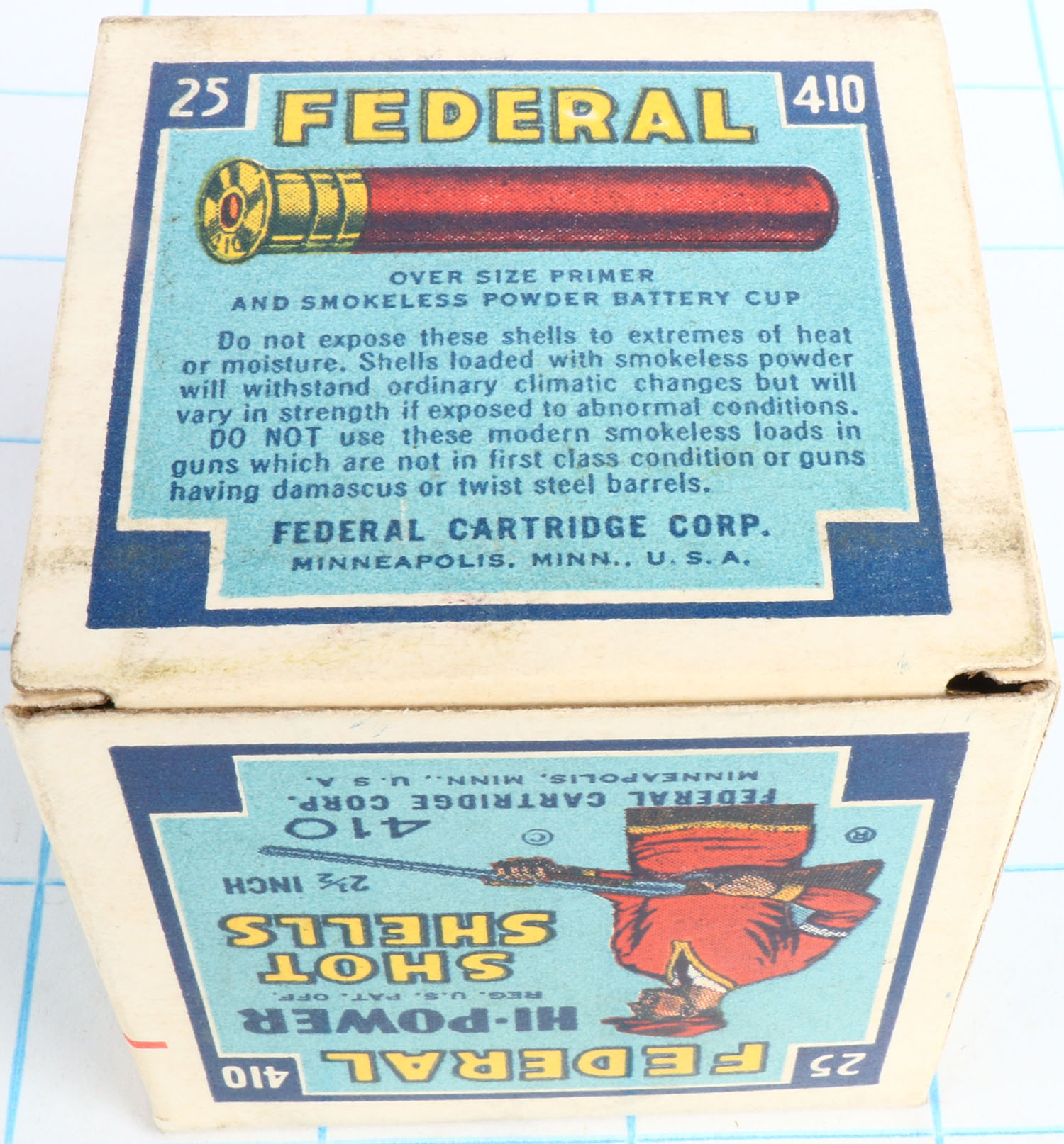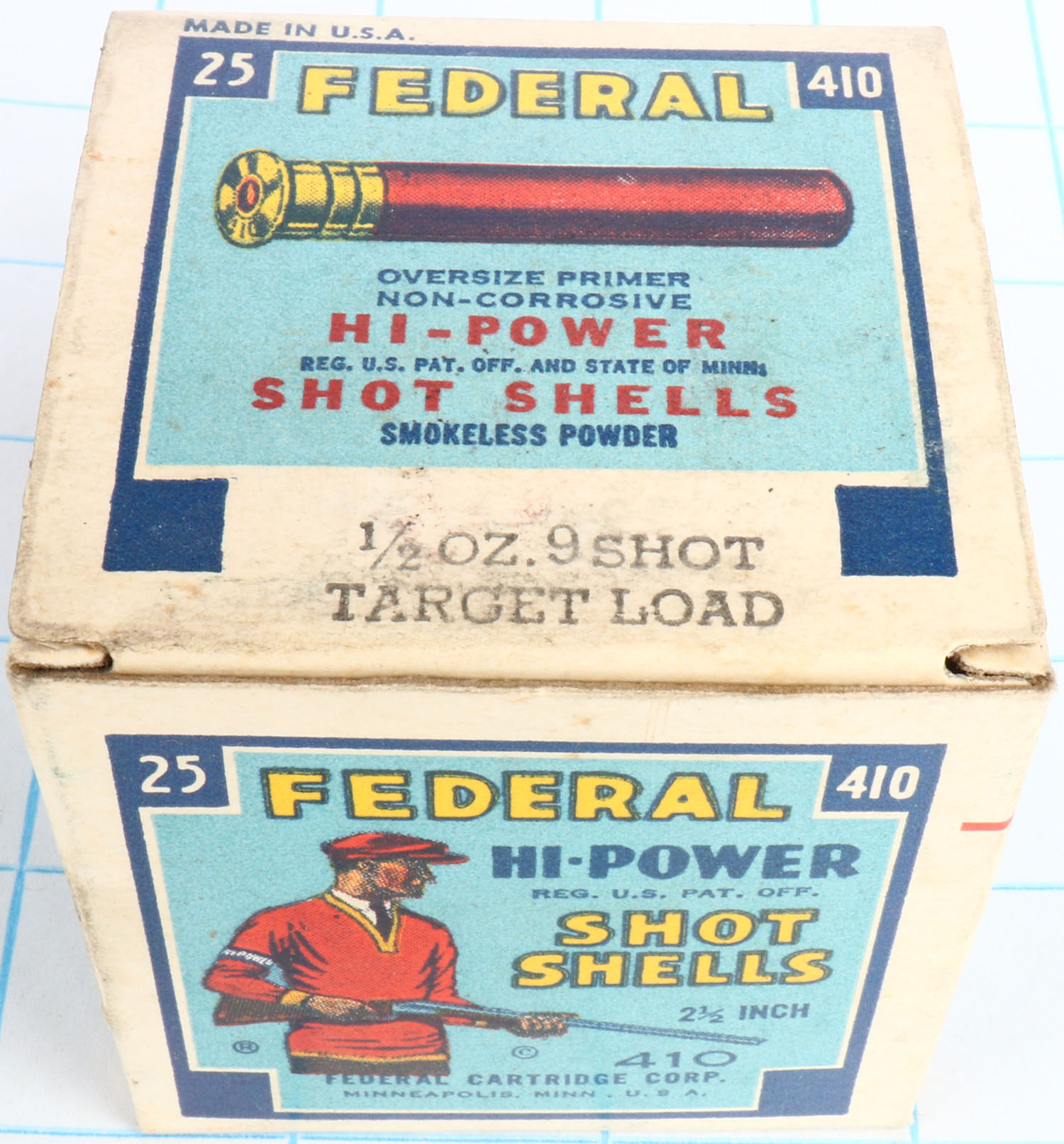 Federal Cart. Co., HI-POWER, 410ga., 1pc., Full, shot size 9 Target Load, 2 1/2'', Blue border, blue, yellow and red box with Trap Shooter, box is solid with great color, shells are excellent. Grade: Excellent - Value: 20 to 60