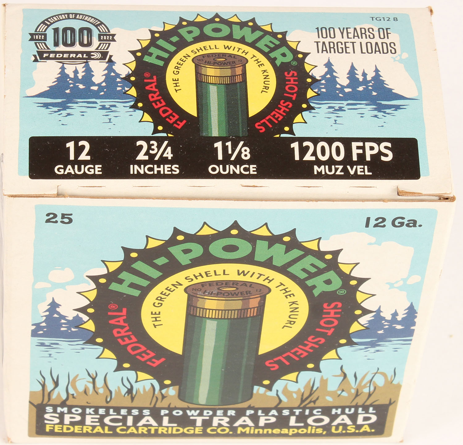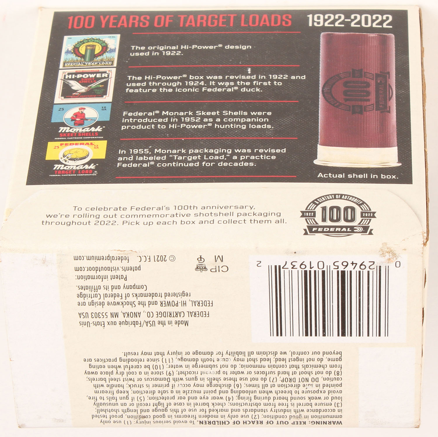 Federal Cart. Co., HI-POWER 100 Year Anniversary, 12ga., 1pc., Full, shot size 8 Special Trap Load, multi-colored box with Original Hi-Power Design, box is very solid with Minty color box shows earlier boxes & when they were introduced also tells little story about Federal, shells are Minty. Grade: Excellent ++ - Value: 20 to 60