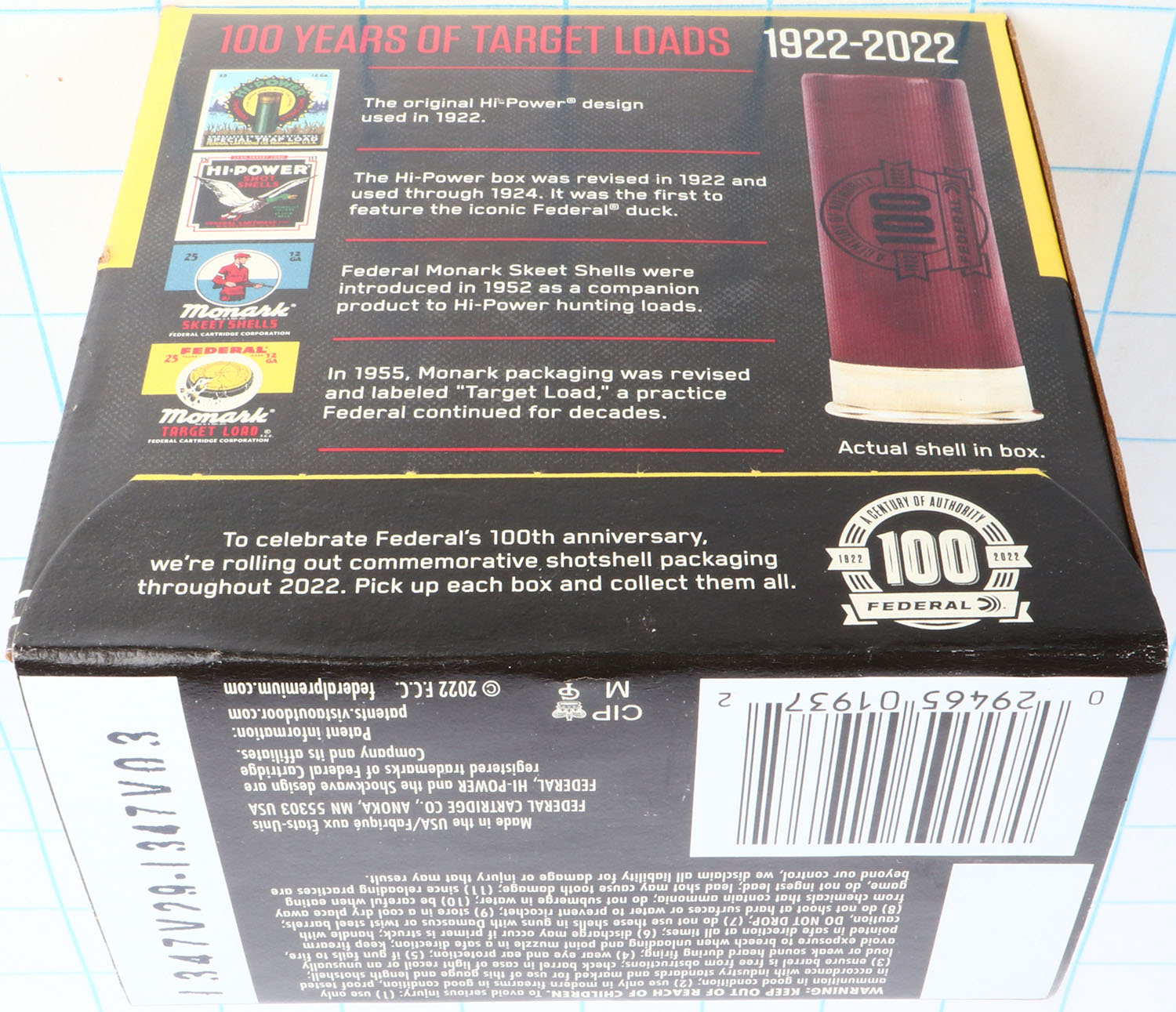 Federal Cart. Co., Monark 100 Year Anniversary, 12ga., 1pc., Full, shot size 8 Target Load, black, yellow and red box with Trap that has shot all around, box very solid with Minty color box shows earlier boxes and when they were introduced also tells little story about Federal, shells are Minty. Grade: Excellent ++ - Value: 20 to 60