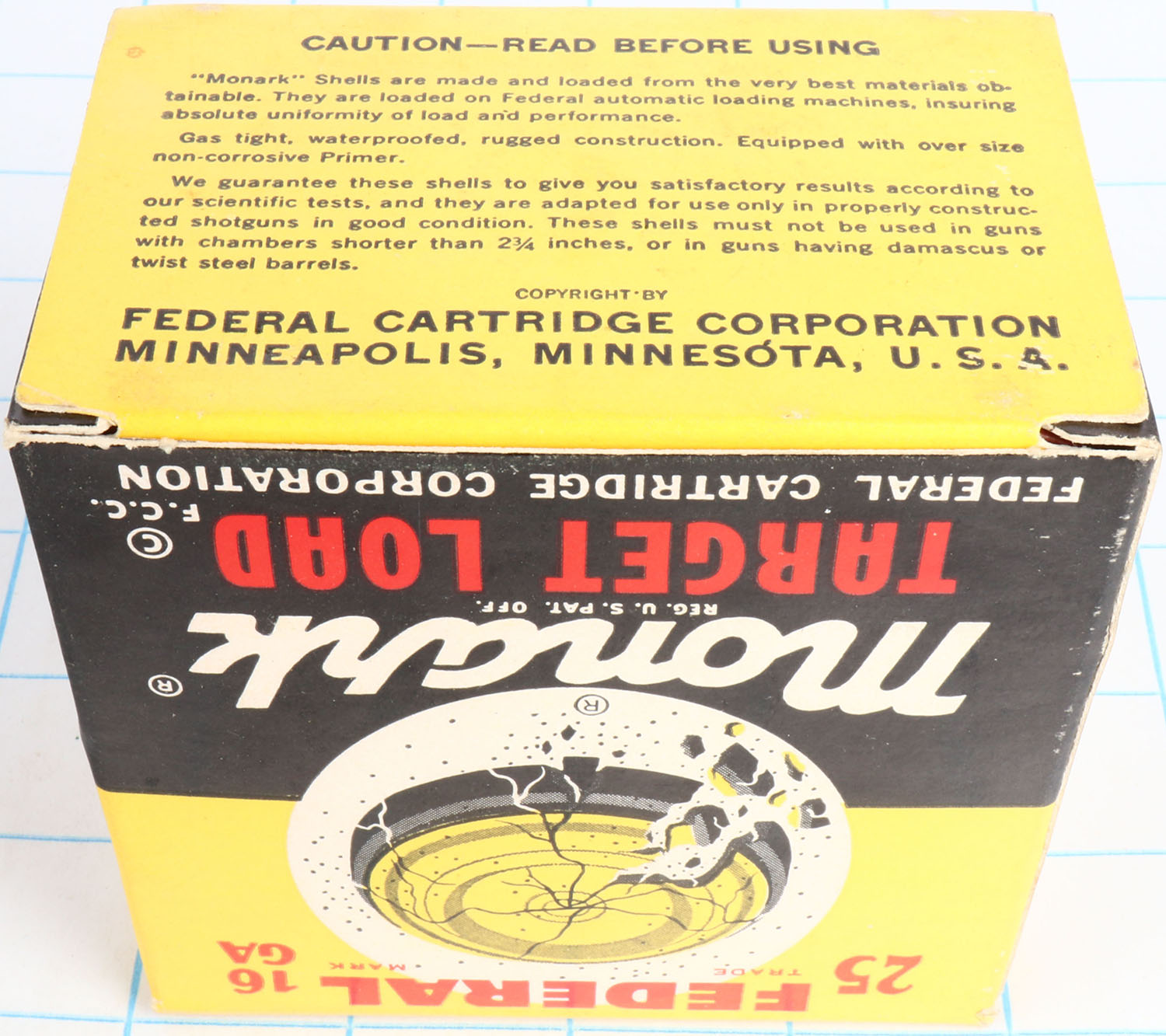 Federal, Monark, Target Load, 16ga., 1pc., Partial 21rds., shot size 8, box has small shell protrusion with great colors, shells are excellent. Grade: Excellent - Value: 10 to 50