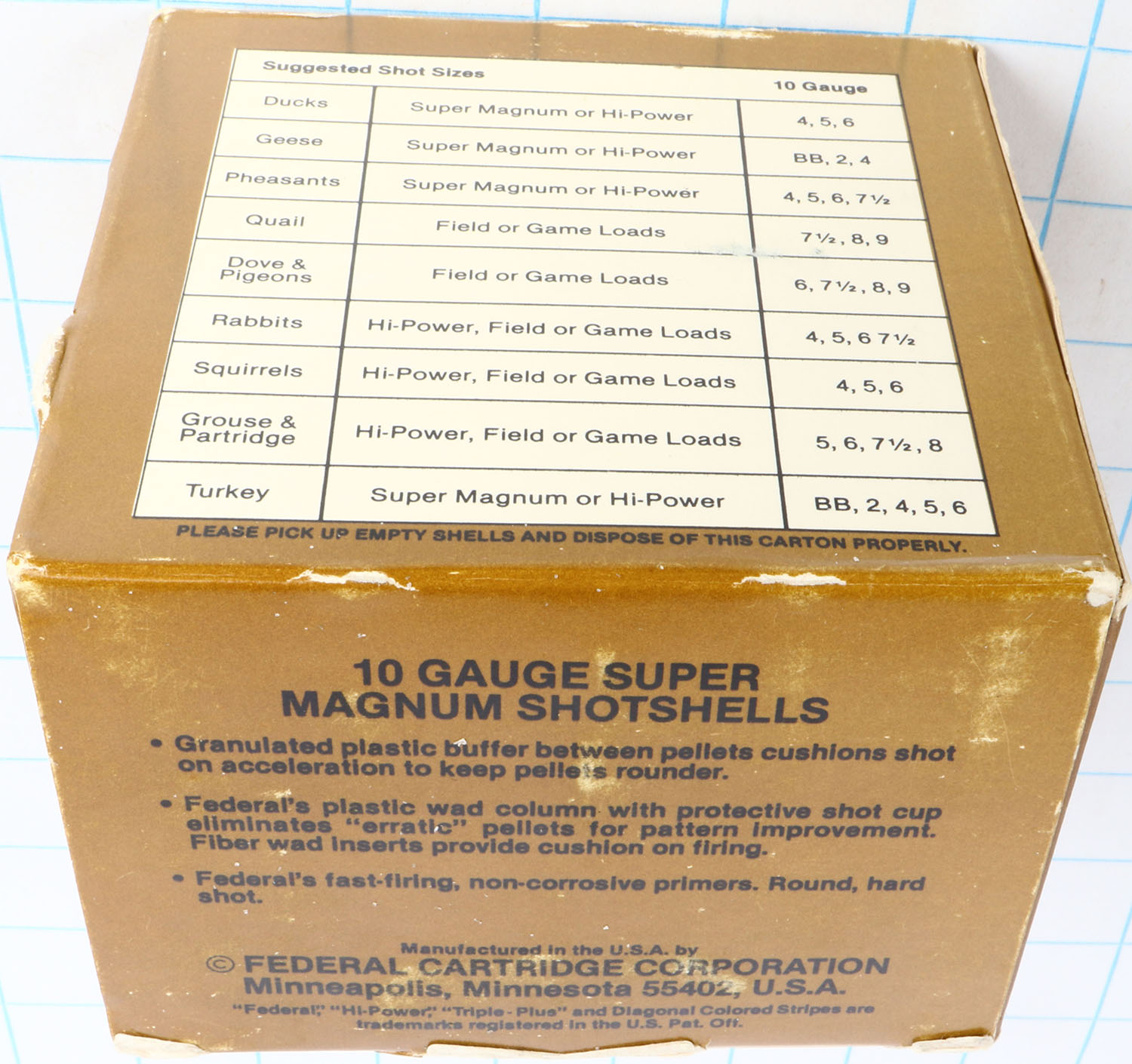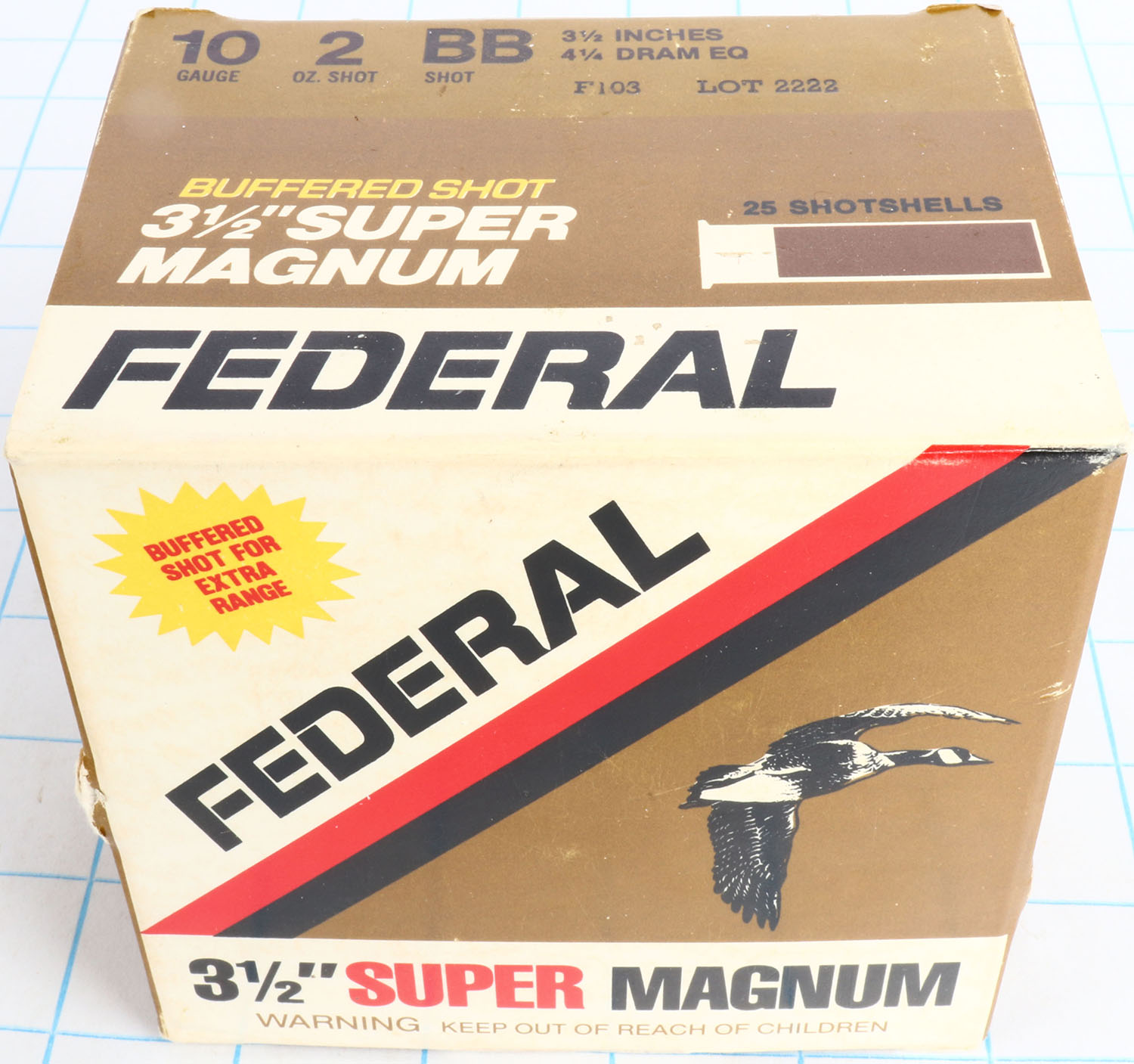 Federal, 10ga., 1pc., Full, shot size BB Super Magnum, box is solid with great colors, shells are excellent. Grade: Excellent - Value: 10 to 30