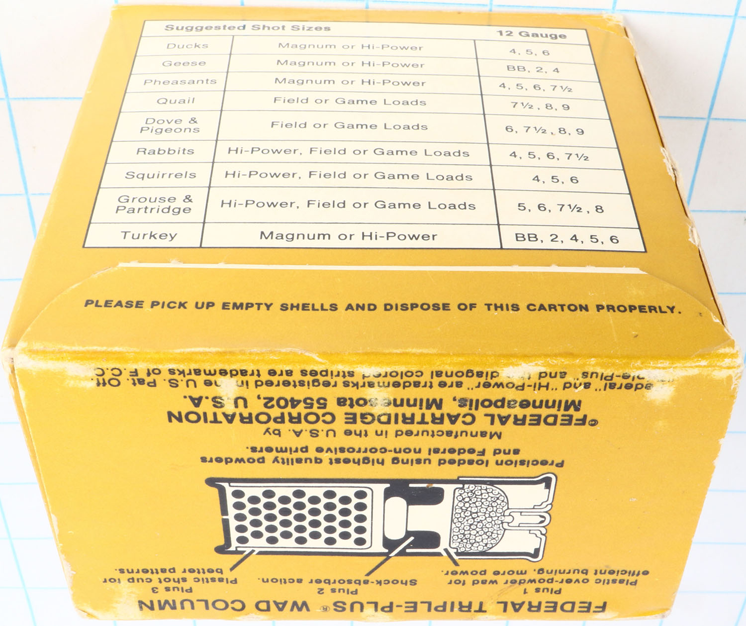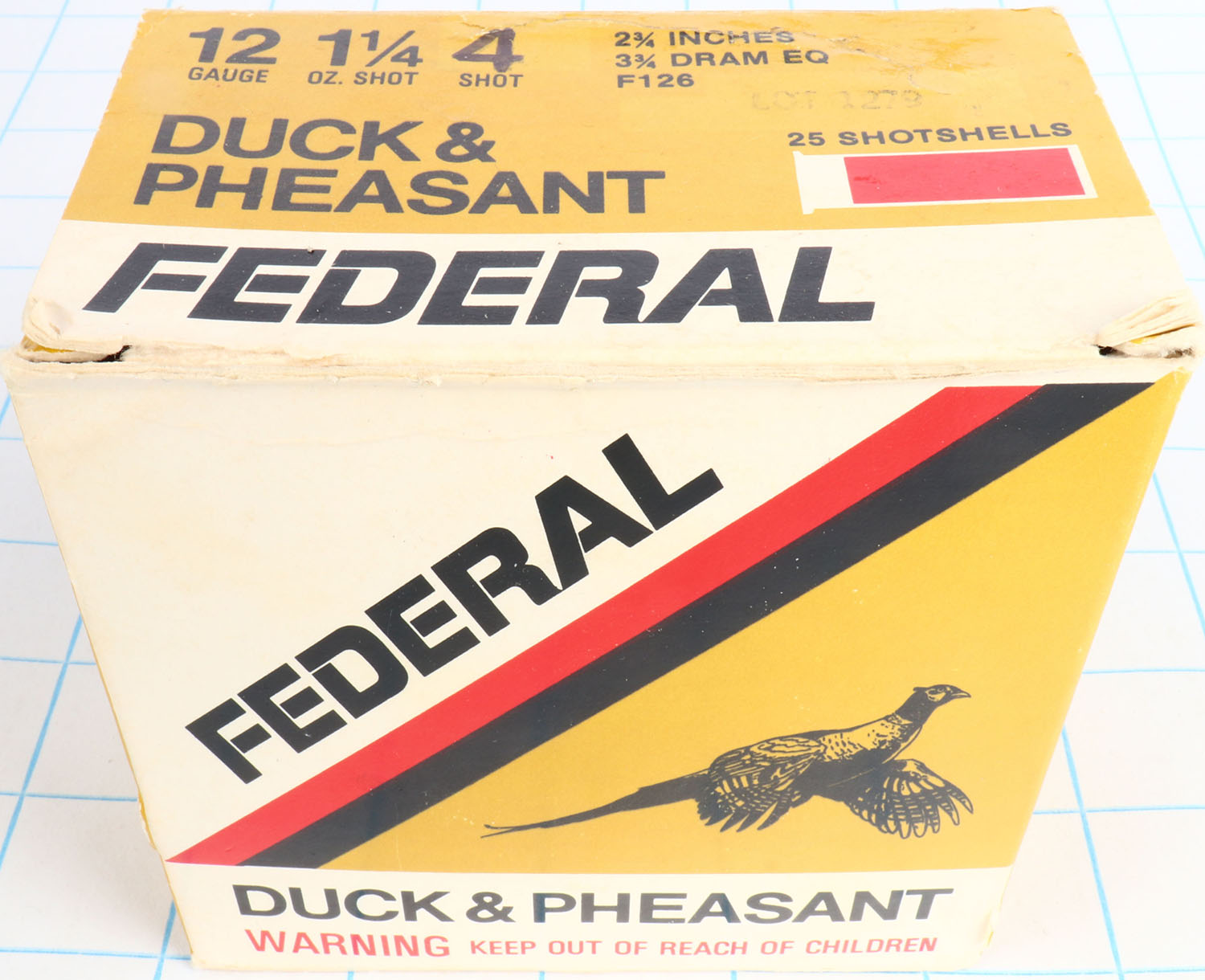 Federal, Duck & Pheasant, 12ga., 1pc., Full with 2rds being incorrect, shot size 4, box is solid with great colors, shells are excellent. Grade: Excellent - Value: 10 to 30