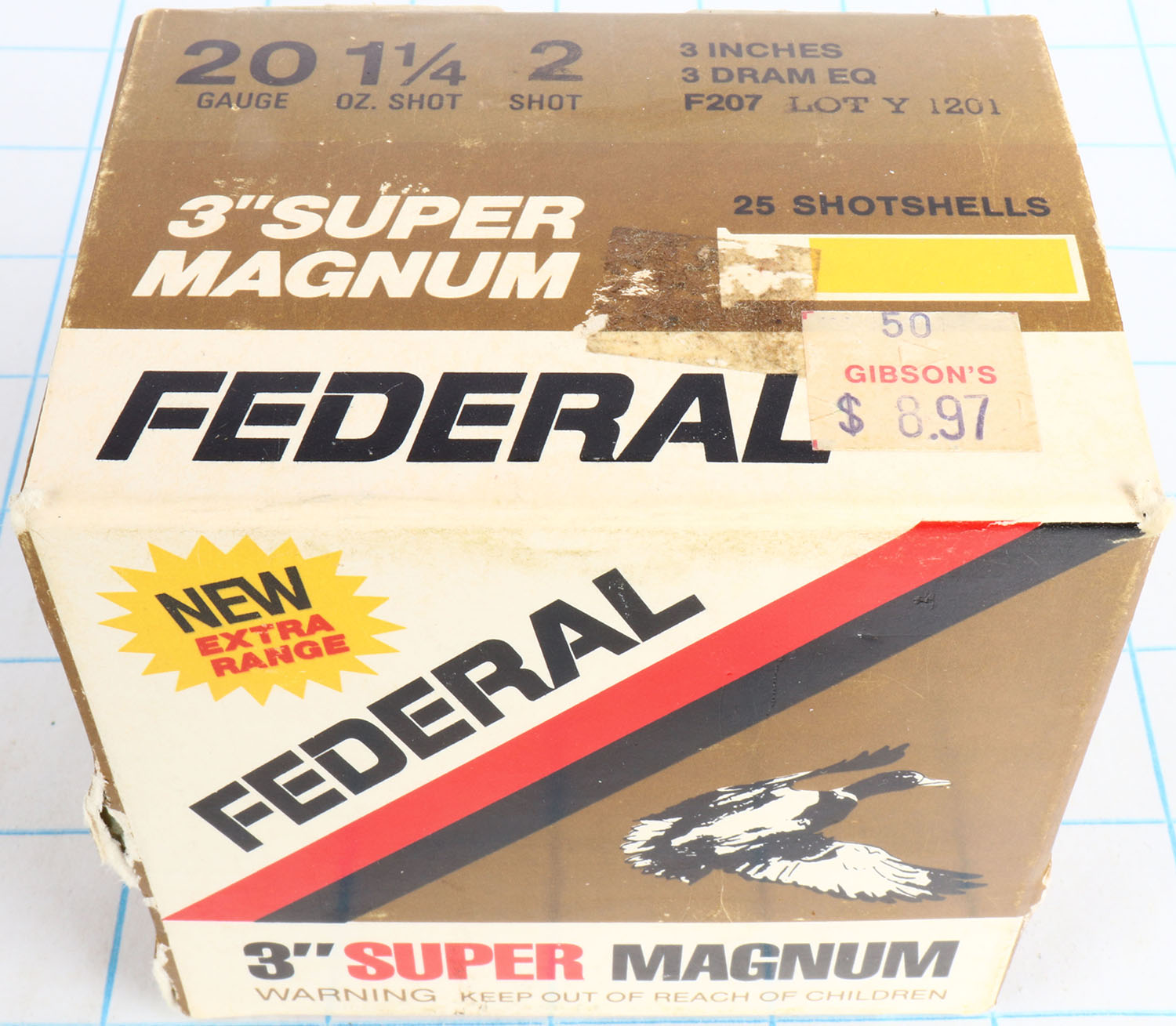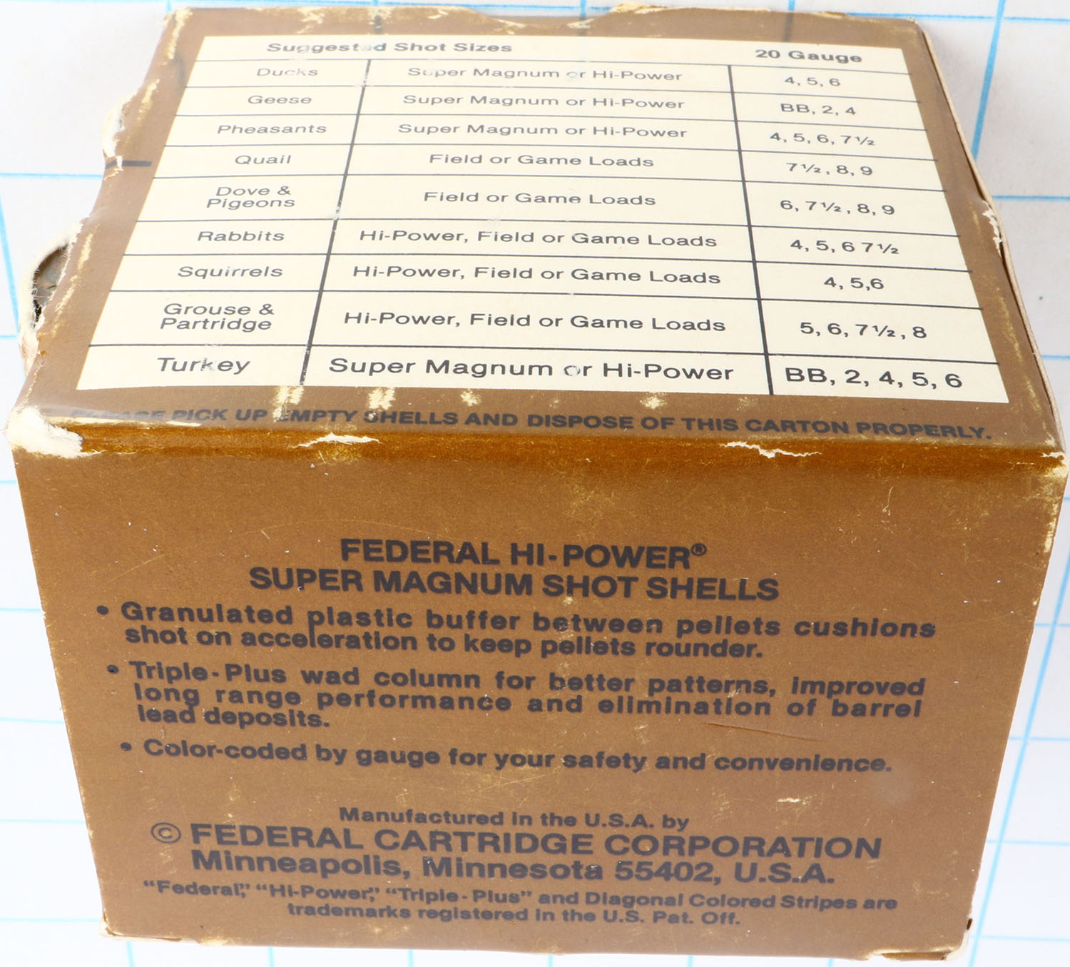 Federal, 20ga., 1pc., Full, shot size 2 Magnum, box has shell protrusions with great colors, shells are excellent. Grade: Excellent - Value: 10 to 30