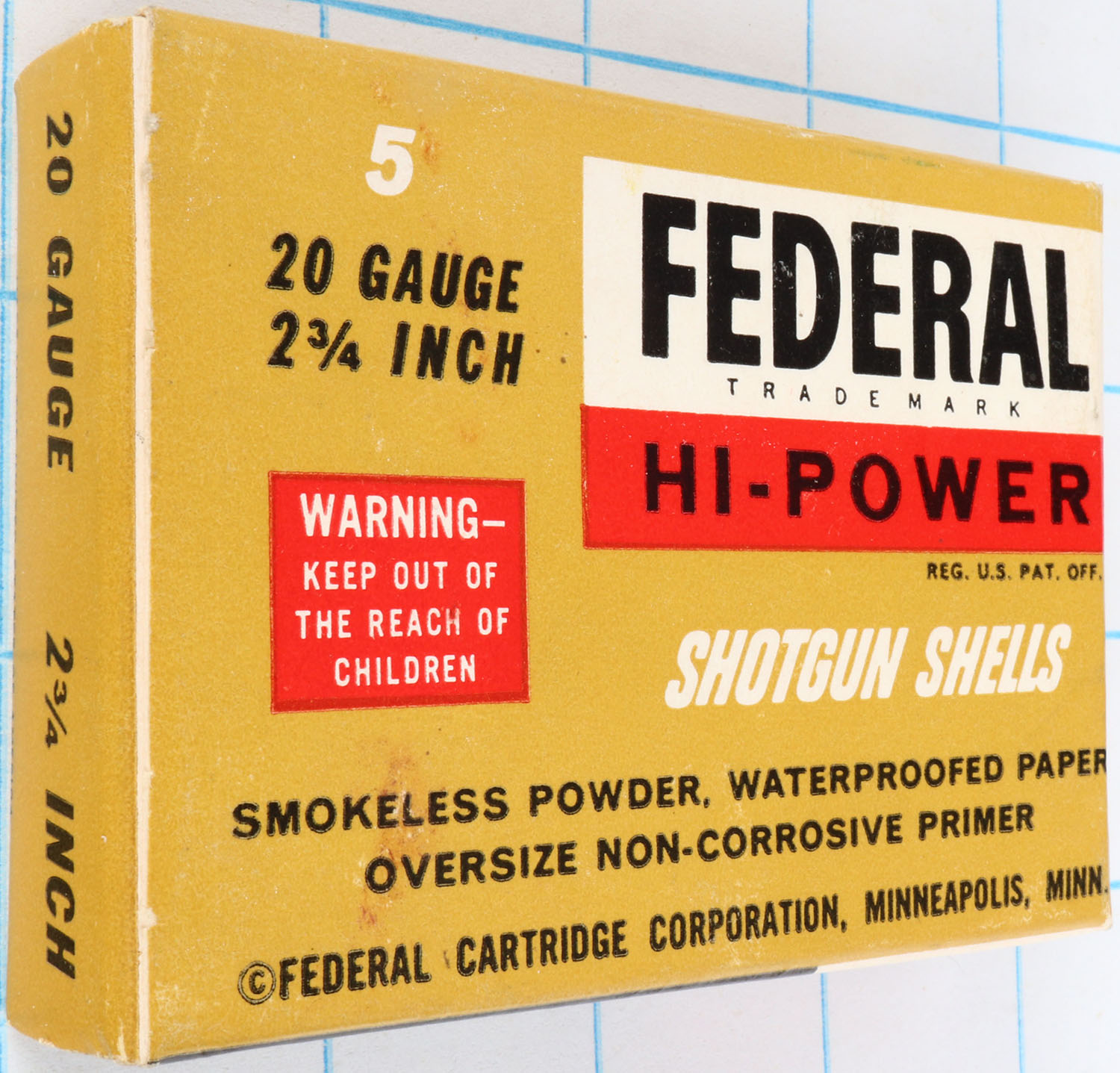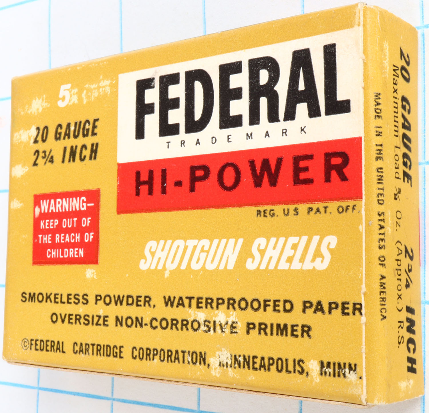 Federal, Hi-Power, 20ga., 1pc., Full, shot size Rifled Slug, box is solid with great colors, shells are excellent. Grade: Excellent - Value: 6 to 20
