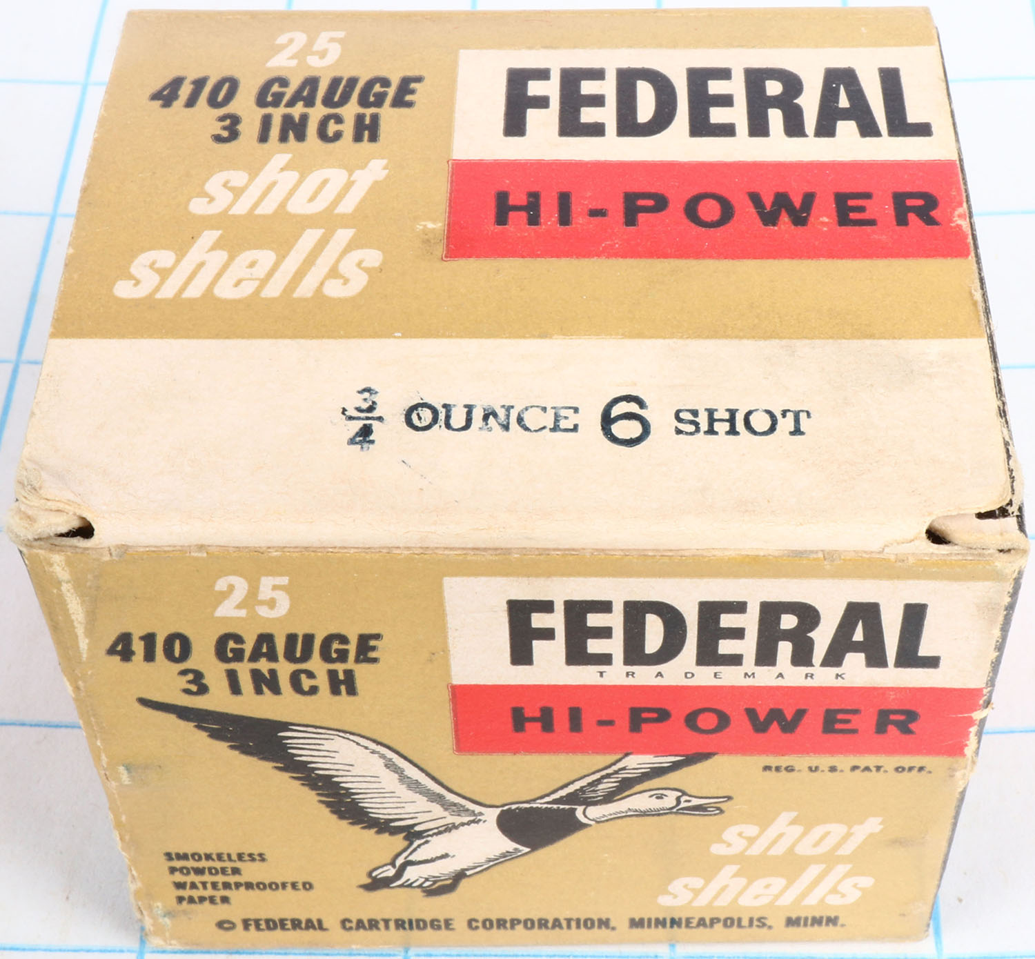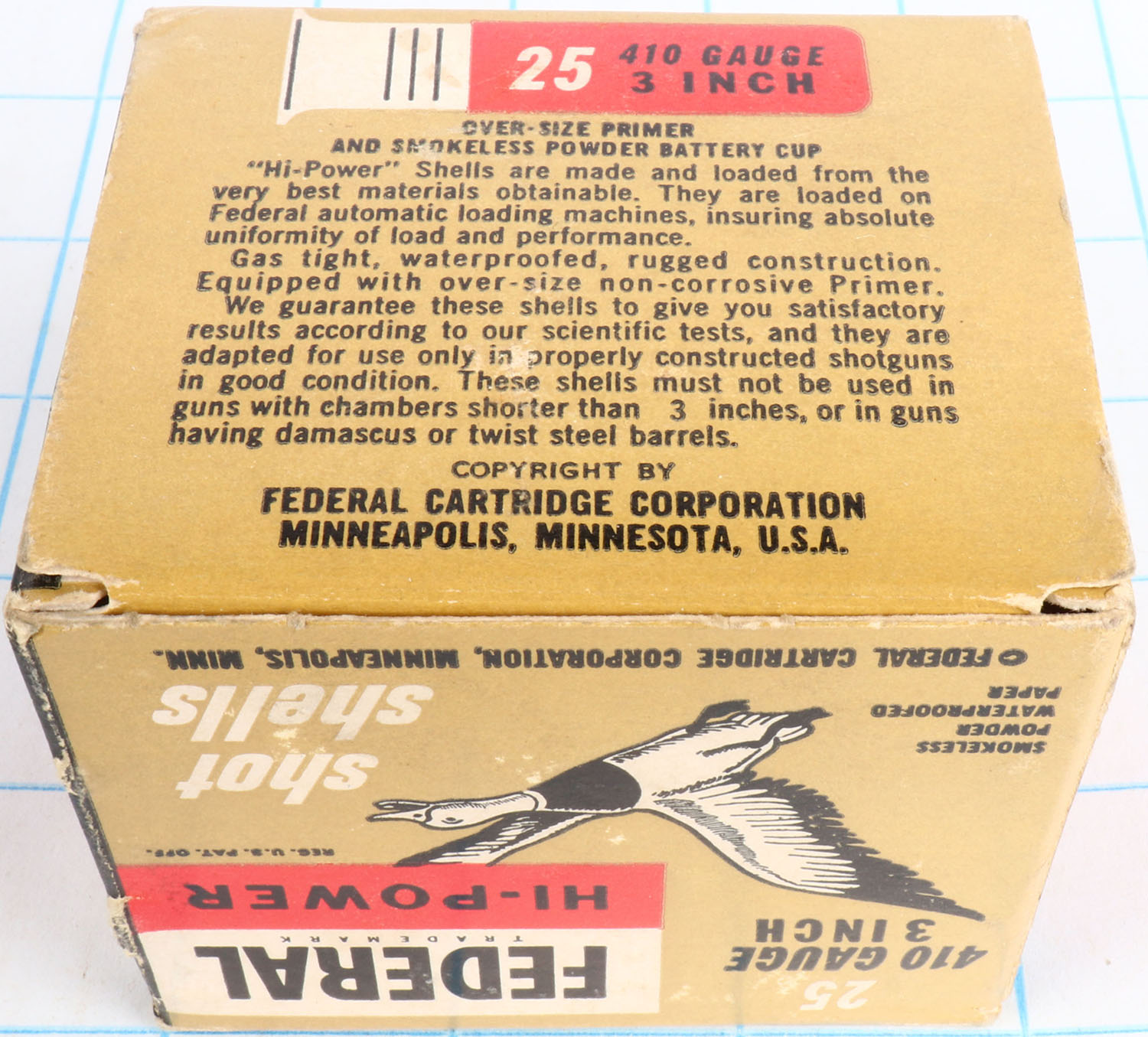 Federal, Hi-Power, 410ga., 1pc., Full with all rds being incorrect shot size, shot size 6, box is solid with great colors, shells are excellent. Grade: Excellent - Value: 10 to 30