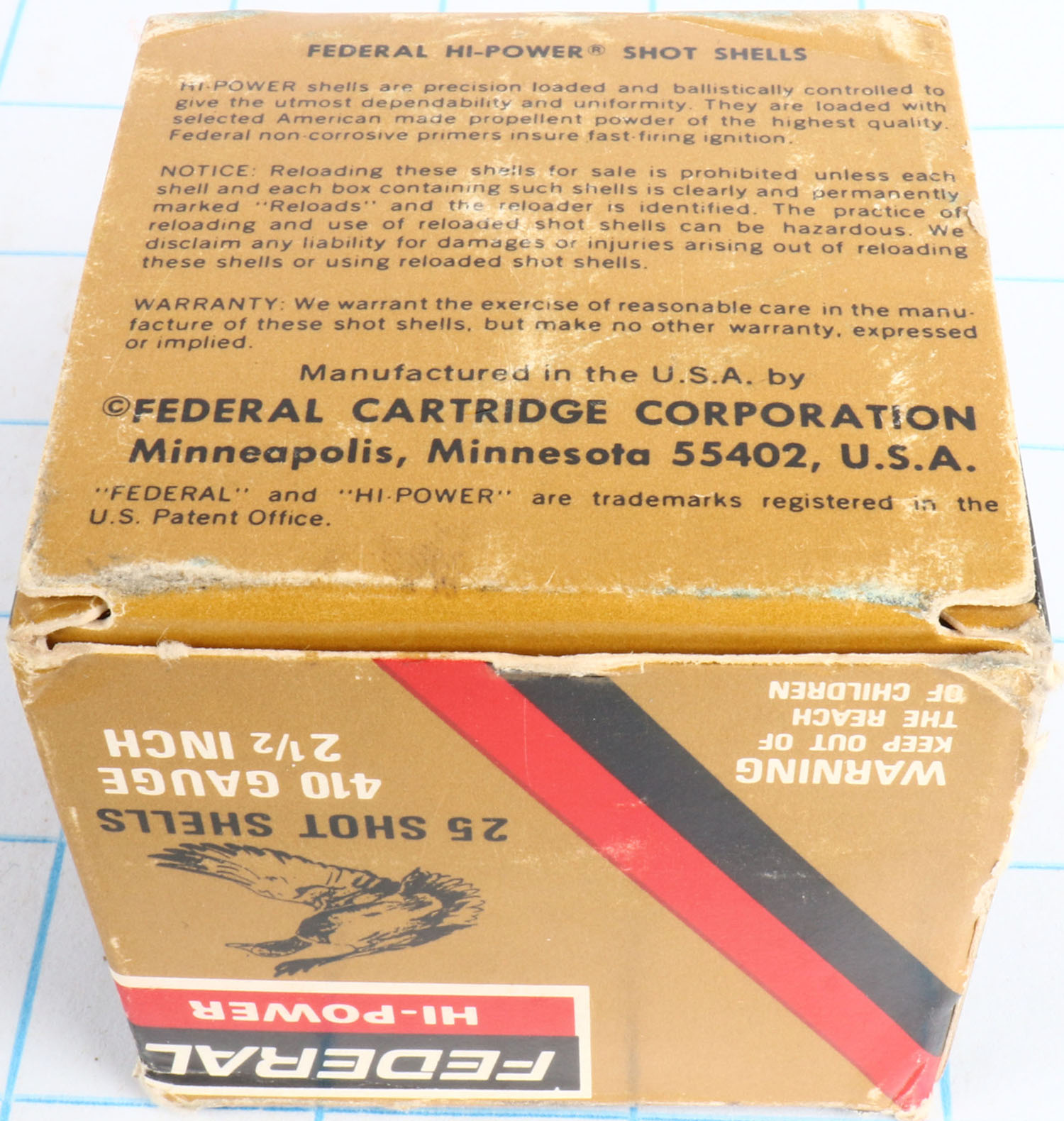 Federal, Hi-Power, 410ga., 1pc., Full with mixed primers, shot size 6, box is solid with great colors, shells are excellent. Grade: Excellent - Value: 10 to 30