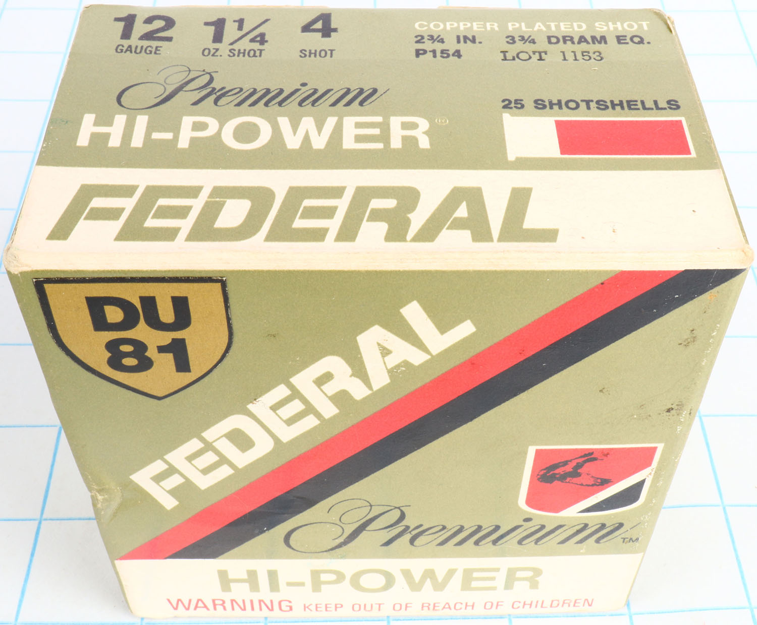 Federal, Premium Hi-Power, 12ga., 1pc., Full, shot size 4, box is solid with great colors, shells are excellent. Grade: Excellent - Value: 10 to 30