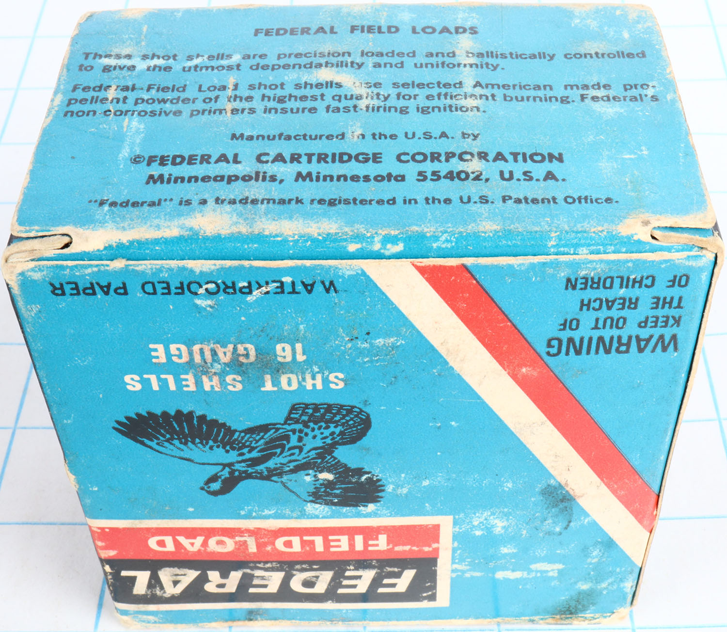 Federal, Field Load, 16ga., 1pc., Full of incorrect brand, shot size 6, box is solid with nice colors, shells are very good. Grade: Very Good ++ - Value: 8 to 30