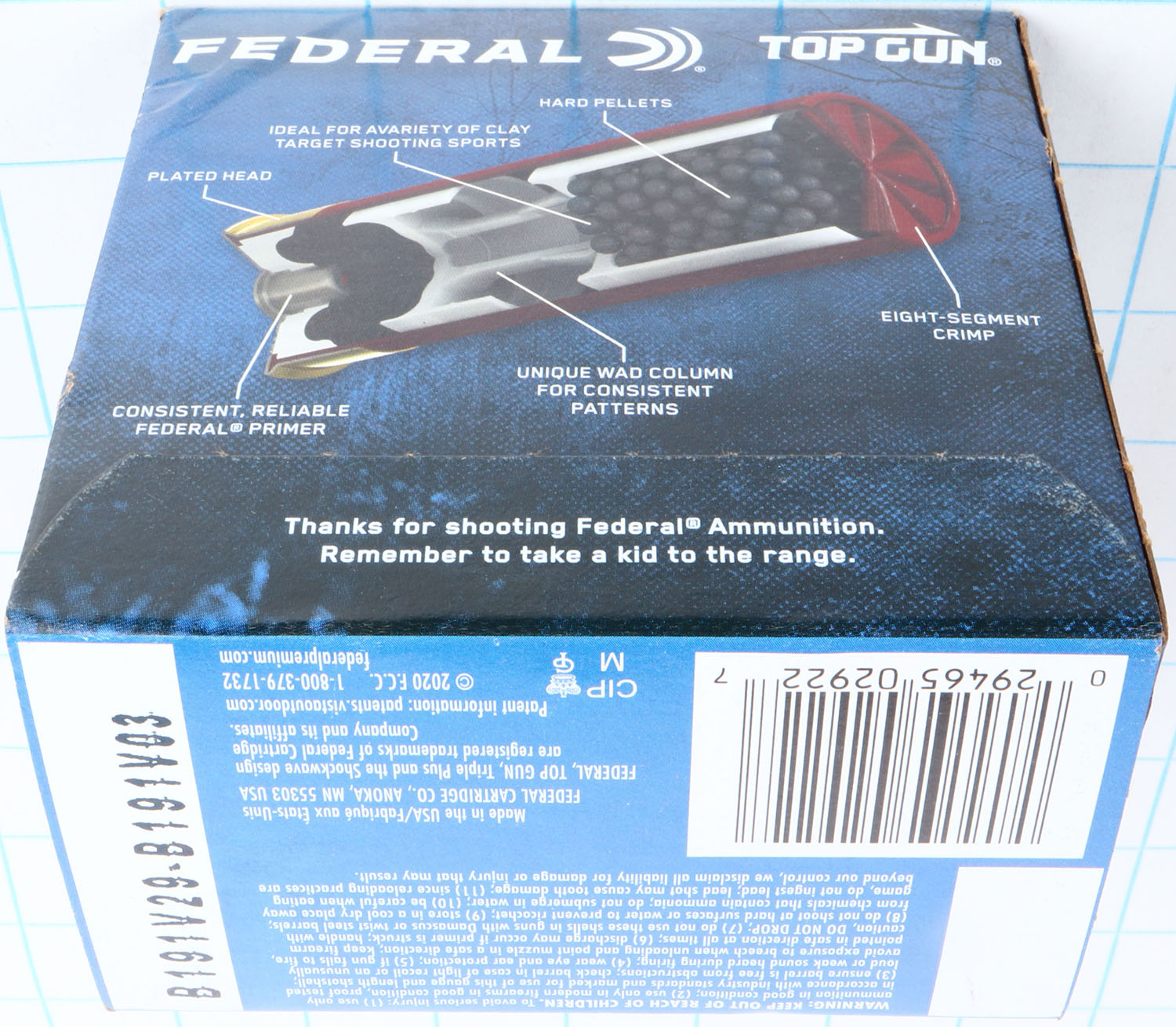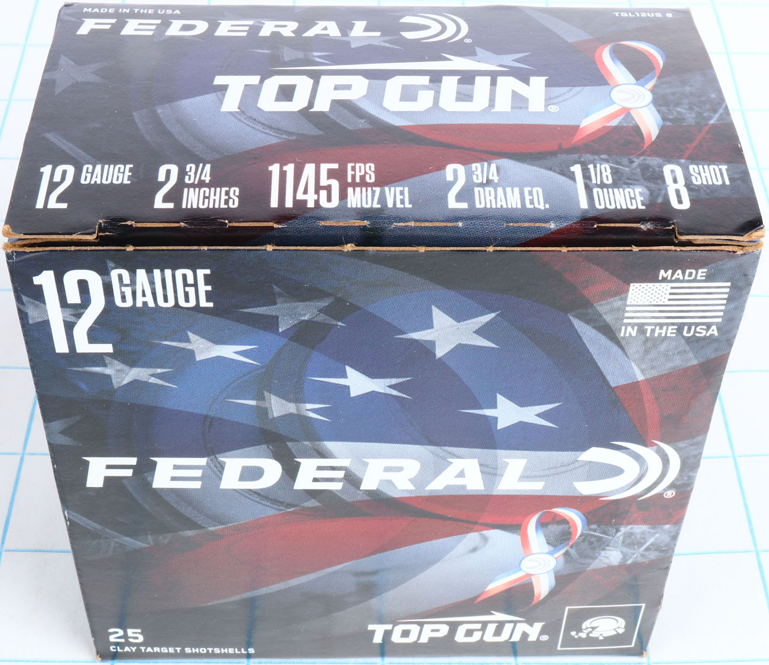 Federal, Top Gun, 12ga., 1pc., Full, shot size 8, box is very solid with great colors, shells are excellent. Grade: Excellent - Value: 10 to 30