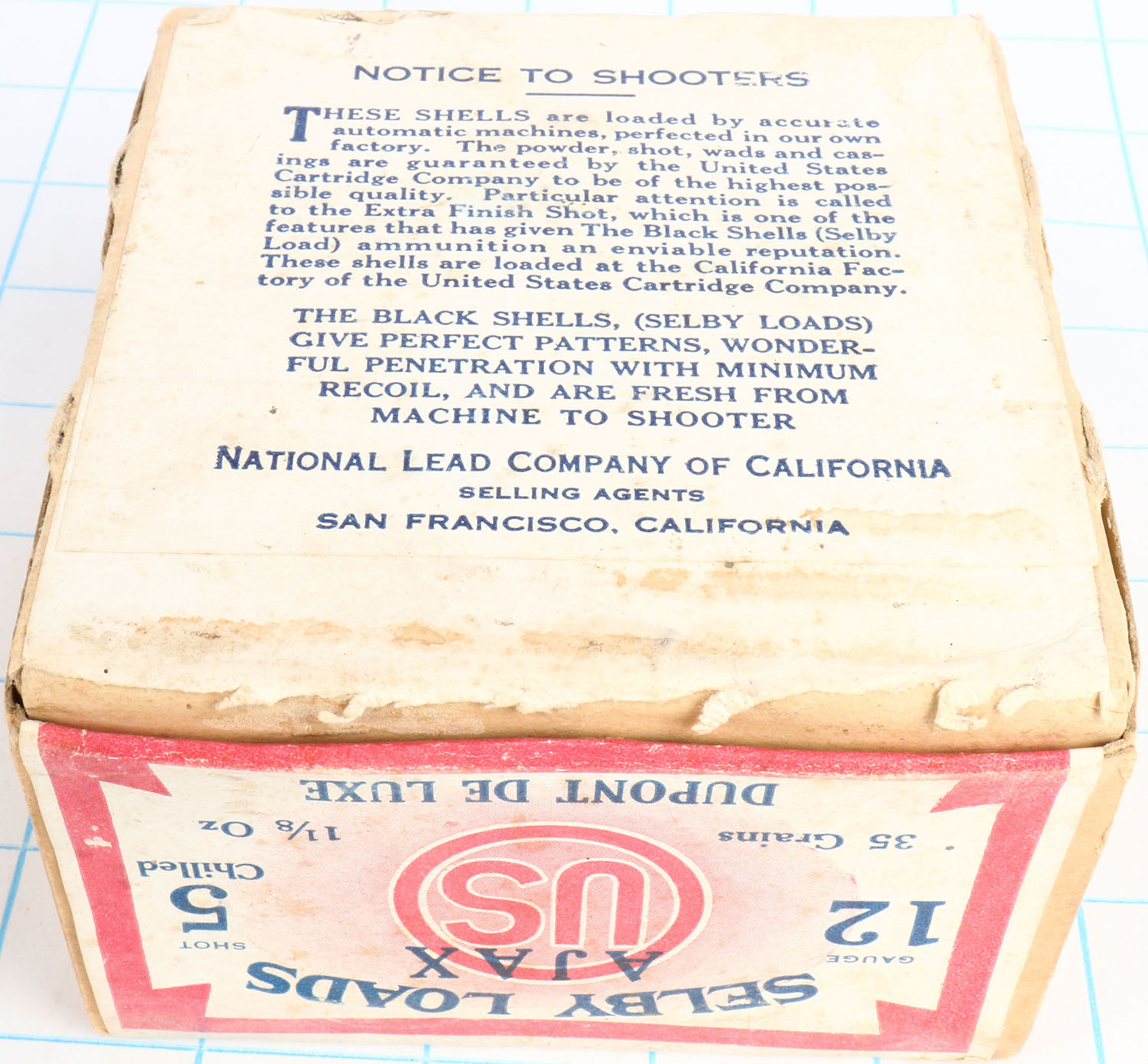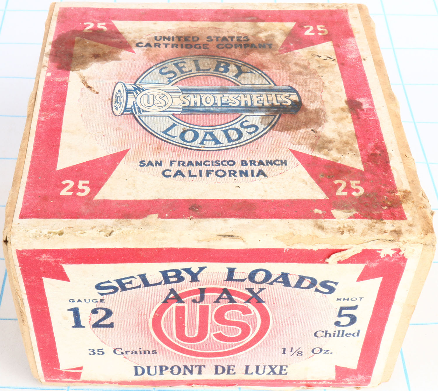 United States Cart. Co., Selby Loads, AJAX Shells, 12ga, 2pc., Full, shot size 5 Chilled, buff box with blue, red & white paper label, box has soiling, label is 98% intact & has very nice colors, Shells are good. Grade: Very Good ++ - Value: 60 to 200
