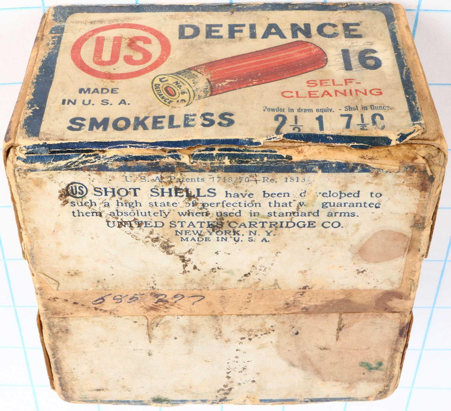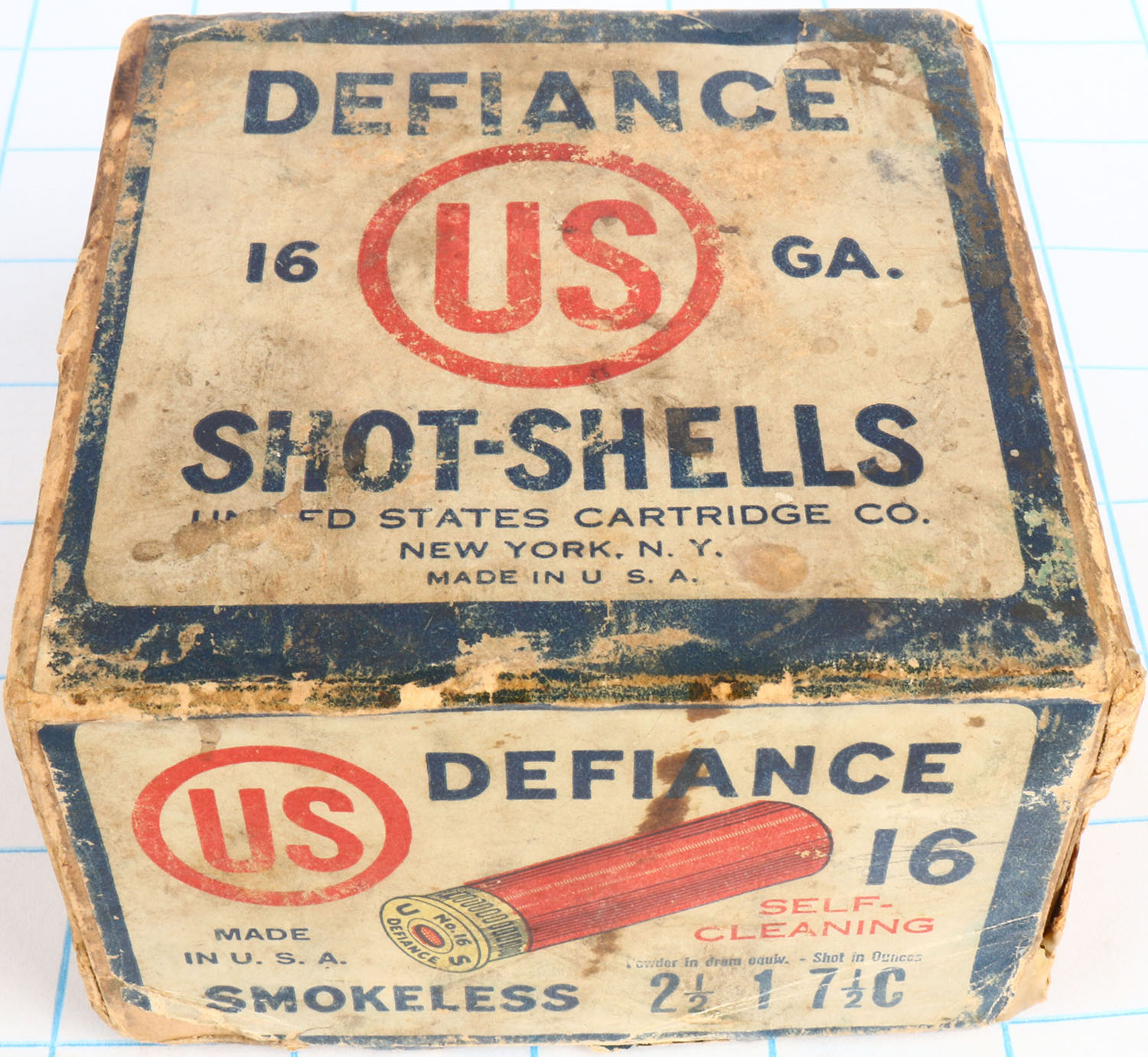 United States Cart. Co., New York, NY, DEFIANCE, 16ga., 2pc., Full of incorrect brand, shot size 7 1/2 C, buff box with white, red & blue label, box has age soiling, scuffing & edge wear with nice label, shells are very good. Grade: Very Good - Value: 20 to 80