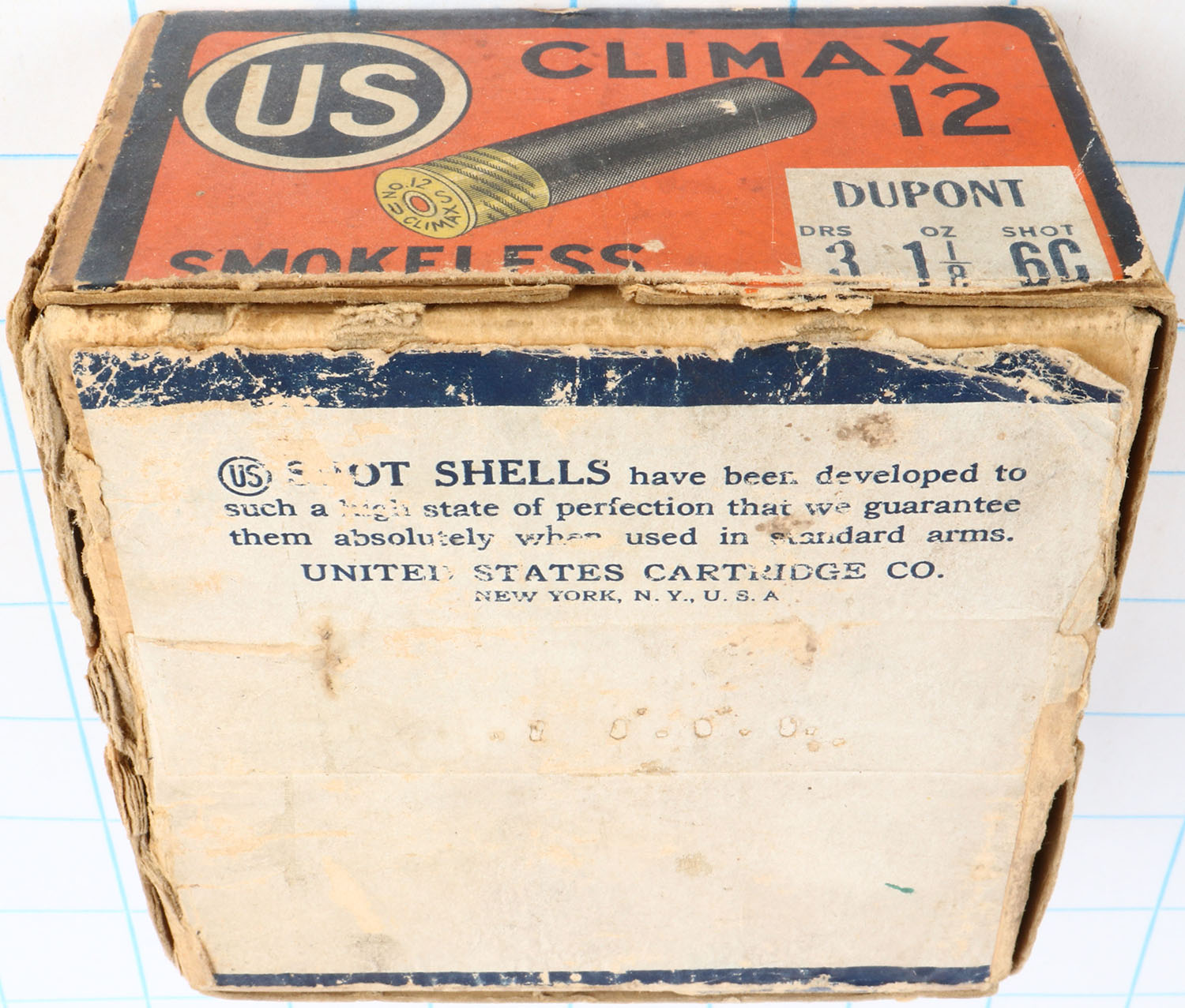 US Cart. Co., New York, NY, Climax, 12ga, 2pc., Empty, shot size 6C, buff box orange, blue & white label, box has edge wear, light soiling, light scuffing & seam splits with very nice colors. Grade: Very Good + - Value: 20 to 80