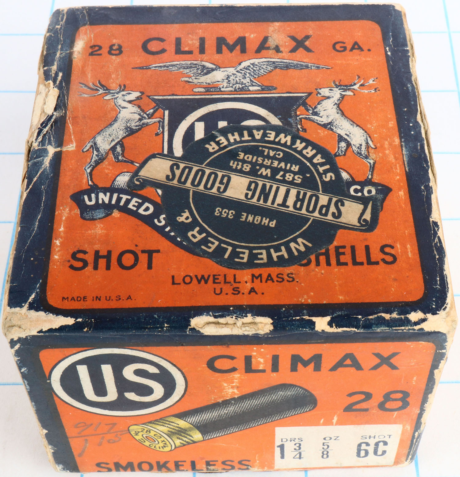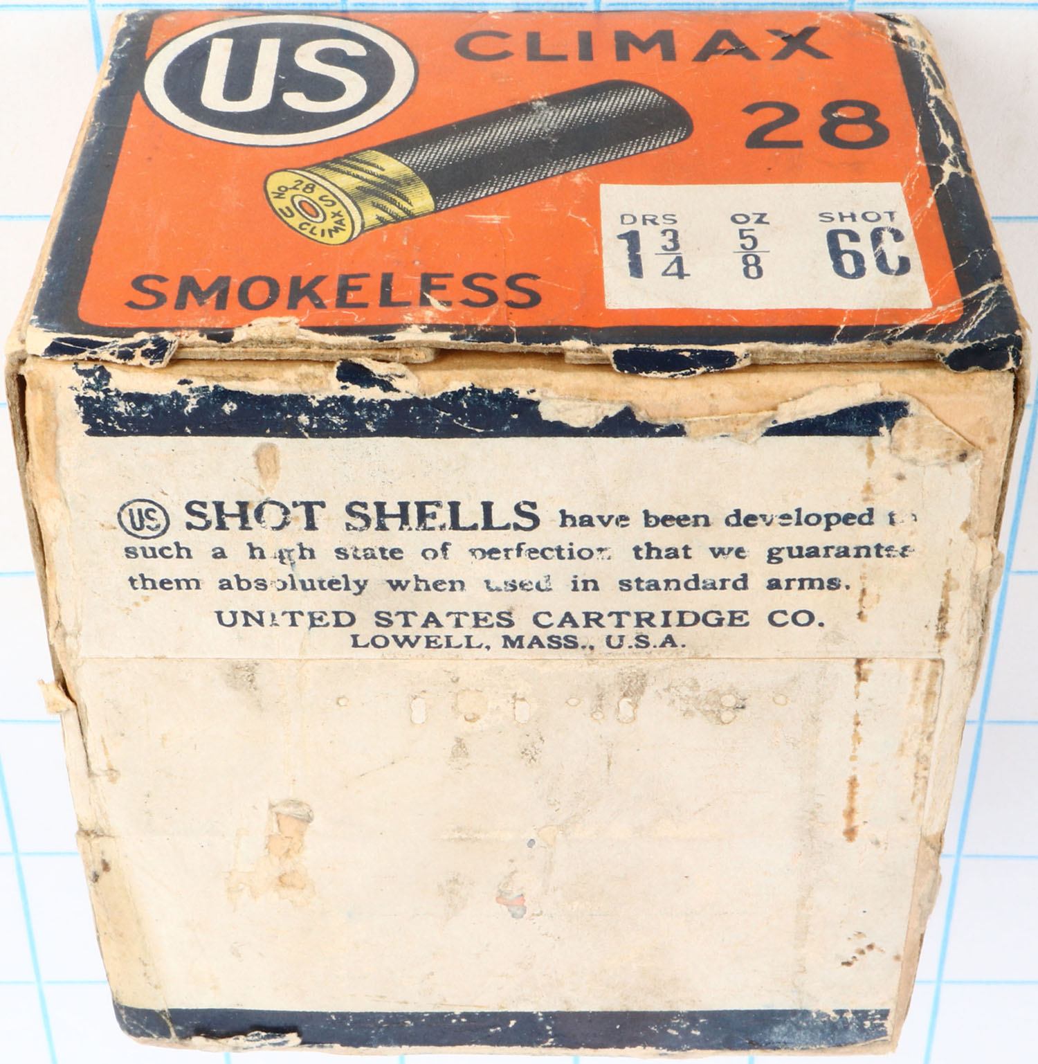 US Cart. Co., Lowell, Mass., Climax, 28ga, 2pc., Full, shot size 6C, buff box orange, blue & white label, box has seam split, edge wear & light scuffing with great colors, shells are very good. Grade: Excellent - Value: 100 to 400