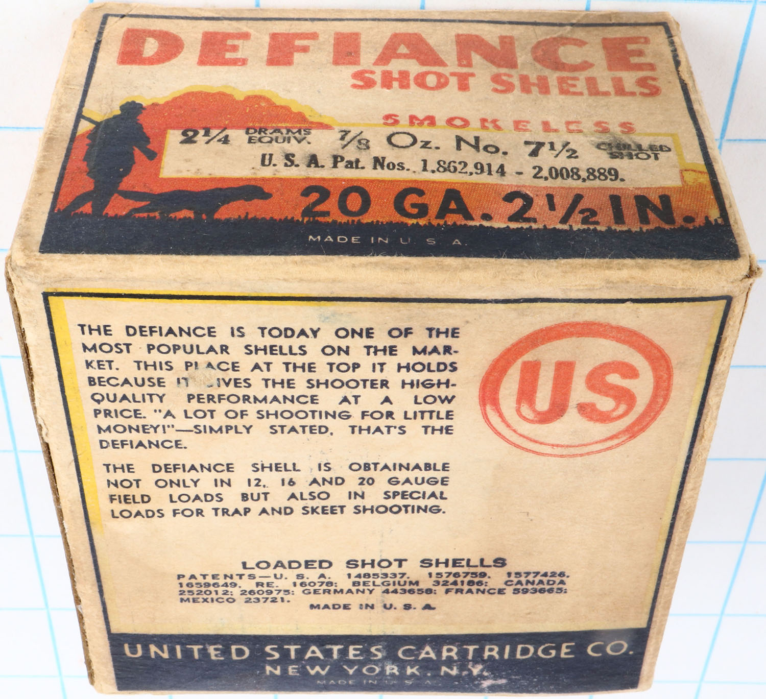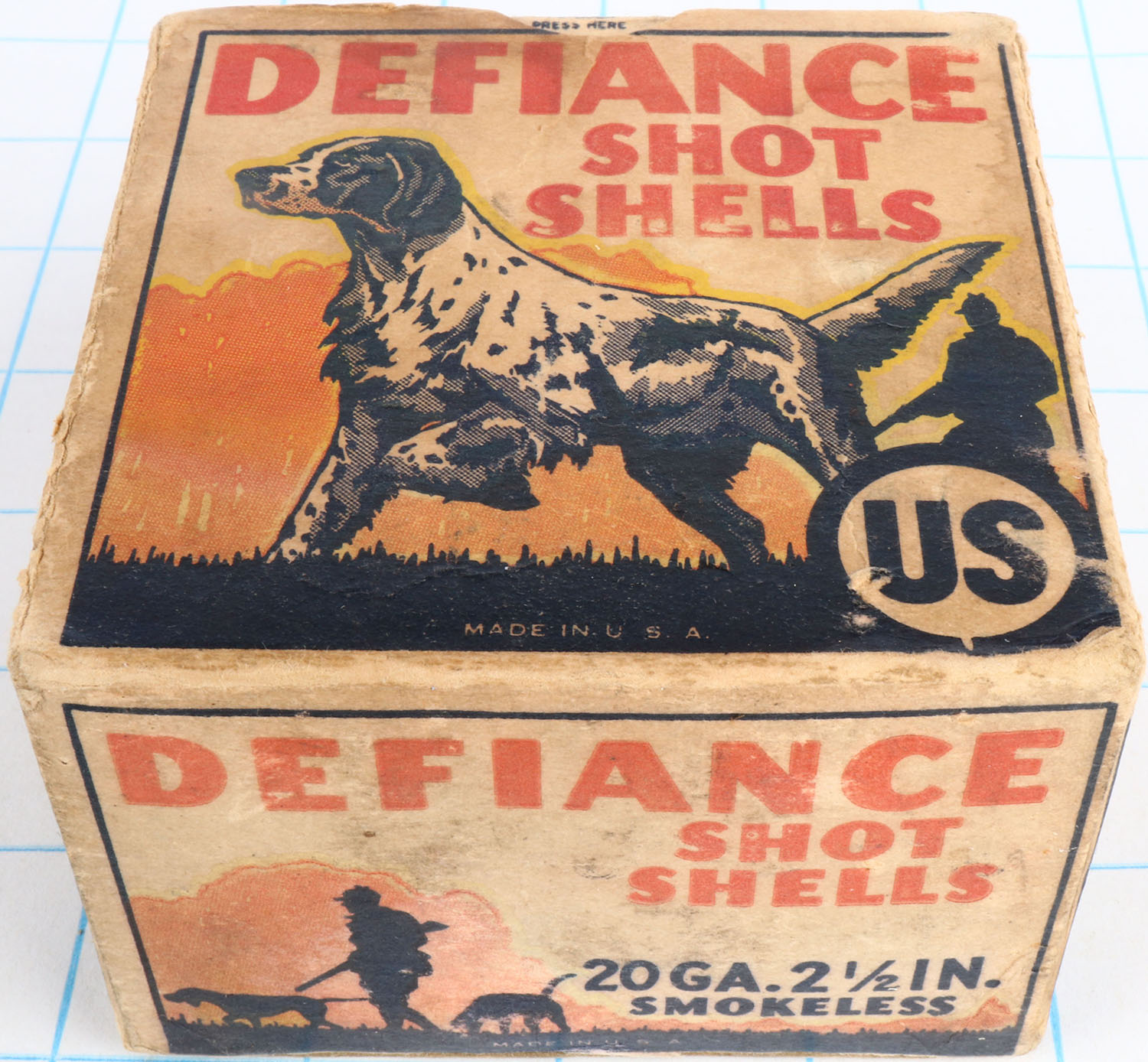 US Cart. Co., Defiance Shot Shells, 20ga., 1pc., Empty, shot size 7 1/2 Chilled Shot, 2 1/2'', white, blue, black, orange and yellow box, very nice graphics showing a dog on point with hunter in background, box has light scuffing & light age soiling. Grade: Very Good ++ - Value: 100 to 400
